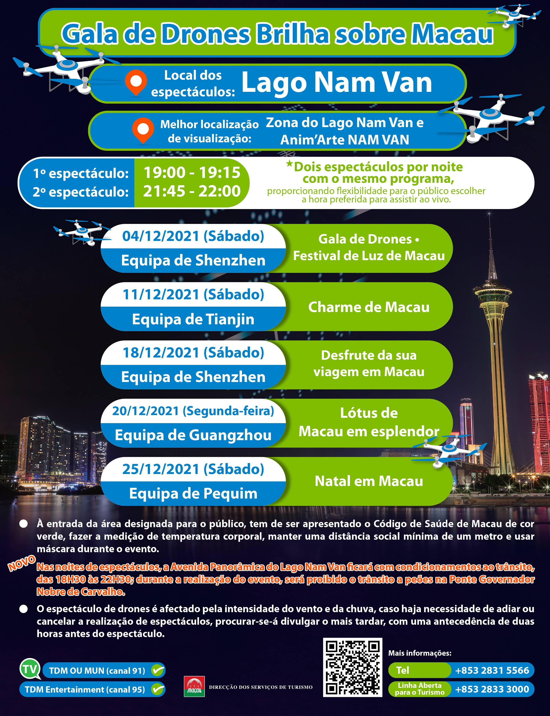 A “Gala de Drones Brilha sobre Macau” prossegue nos dias 18, 20 e 25 deste mês, enfeitando de cor e luz o céu da cidade em Dezembro, e celebrando em conjunto o Dia Comemorativo do Estabelecimento da RAEM e o Natal. Cada noite decorre sob um tema diferente, tendo as duas sessões de cada noite o mesmo programa. Os espectáculos de drones são acompanhados de música e narração, tendo sido instalados altifalantes, na zona pedonal da Avenida Panorâmica do Lago Nam Van, no lado do lago, entre o Anim'Arte NAM VAN e a zona das tendas brancas, para aumentar o impacto e a atmosfera dos espectáculos, e permitir aos espectadores experienciar o entretenimento audiovisual.