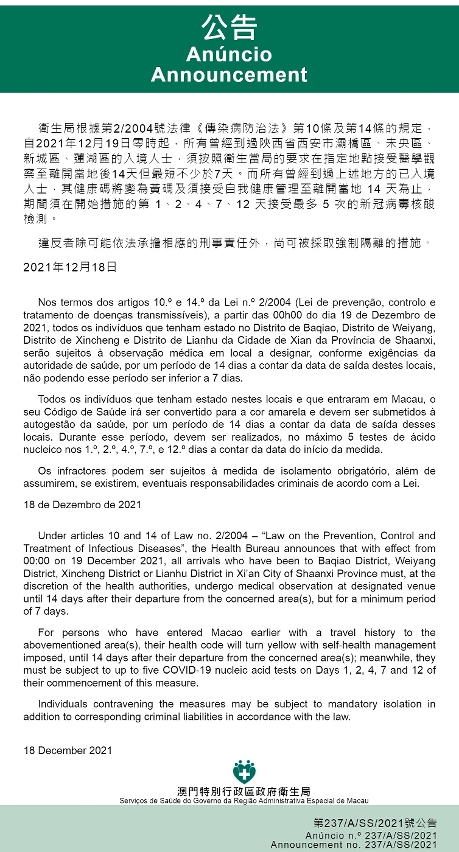O Centro de Coordenação de Contingência do Novo Tipo de Coronavírus informa que tendo em consideração a evolução epidemiológica mais actualizada na Província de Shaanxi, a partir das 00h00 do dia 19 de Dezembro de 2021, todos os indivíduos que tenham estado no Distrito de Baqiao, Distrito de Weiyang, Distrito de Xincheng eDistrito de Lianhu da Cidade de Xian da Província de Shaanxi, serão sujeitos à observação médica em local a designar, conforme exigências da autoridade de saúde, por um período de 14 dias a contar da data de saída destes locais, não podendo esse período ser inferior a 7 dias.