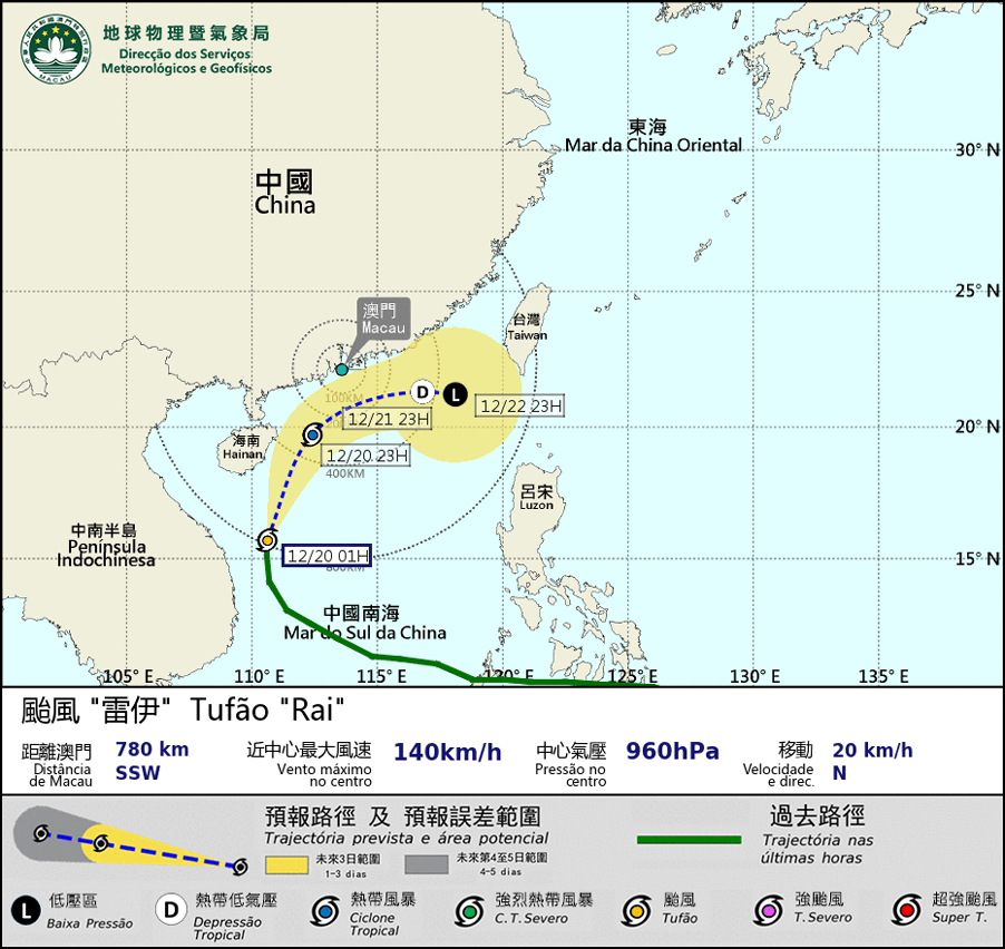O super tufão “Rai”enfraqueceu para um(a) tufão. Presentemente, esteve a cerca de 780 km a su-sudoeste de Macau, e está a aproximar-se gradualmente de Macau e espera-se que cruze o ponto mais junto do território, a cerca de 200 km a sul de Macau. As bandas de chuva associadas vão afectar Macau hoje (20) e amanhã (21). Na altura, podem ocorrer aguaceiros mais frequentes e contínuos na região. O vento pode atingir o nível 6 da Escala de “Beaufort” com rajadas. Embora "Rai" enfraqueça, a trajectória de movimento está prevista para mais perto de Macau do que o esperado. Por este motivo, aconselha-se à população que preste atenção à variação das condições atmosféricas e às informações mais recentes sobre o tufão.