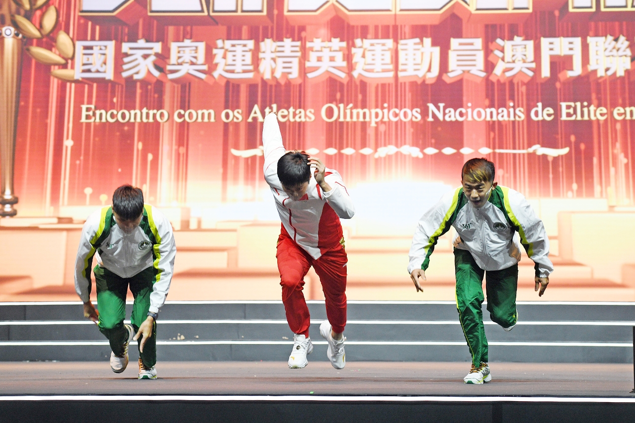 Às 10h00, a delegação participou no evento “O nosso orgulho – Diálogo entre os Atletas Olímpicos Nacionais de Elite e os jovens atletas de Macau”, realizado no Pavilhão Desportivo do Centro Desportivo Olímpico, tendo os atletas de elite partilhado com 500 jovens atletas das equipas de estágio e alunos das escolas de desporto as suas experiências sobre crescimento pessoal, sofrimento e alegrias vividas durante os treinos e as competições, bem como interagiram com atletas de Macau nas modalidades de ténis de mesa e badminton. Entre a comitiva oito atletas: Ma Long (ténis de mesa), Xu Xin (ténis de mesa), Xie Siyi (salto de trampolim), Lu Xiaojun (levantamento do peso), Zhong Tianshi (ciclismo de pista), Sun Yiwen (esgrima), Gong Lijiao (atletismo), Su Bingtian (atletismo), em conjunto com representantes de atletas de Macau, Kuok Kin Hang, Huang Junhua, e Au Hoi Ian, dialogaram com os estudantes e partilharam com alegria as medalhas conquistadas nos Jogos Olímpicos em especial a glória alcançada para o País. Houve ainda alunos que perguntaram como insistir quando se sente frustração em competições, e como ajustar a mentalidade face a importantes provas para potenciar o melhor resultado. Os Atletas Olímpicos Nacionais de Elite explicaram abertamente que o segredo do sucesso é persistir e nunca desistir e acrescentaram que, para além do amor ao desporto existe também dentro de um atleta força para perseverar e continuar a lutar constantemente e dar o melhor em todos os desafios. Os atletas também incentivaram os jovens a aproveitarem bem as oportunidades durante as competições, ajustar a mentalidade para potenciar o melhor de cada um com confiança e competirem sem arrependimentos.
