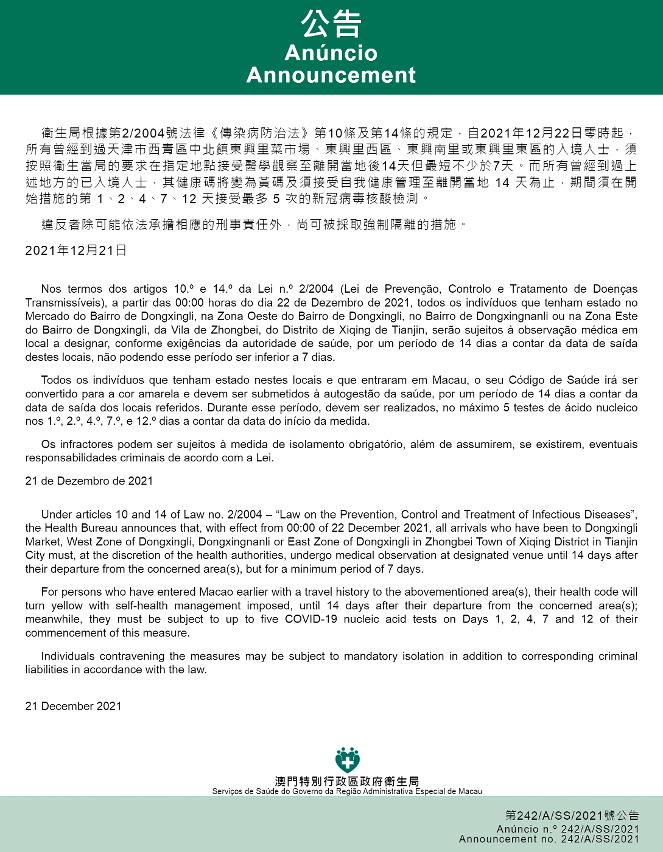 O Centro de Coordenação de Contingência do Novo Tipo de Coronavírus informa que tendo em consideração a evolução epidemiológica mais actualizada em Tianjin, a partir das 00h00 do dia 22 de Dezembro de 2021, todos os indivíduos que tenham estado no Mercado do Bairro de Dongxingli, na Zona Oeste do Bairro de Dongxingli, no Bairro de Dongxingnanli ou na Zona Este do Bairro de Dongxingli, da Vila de Zhongbei, do Distrito de Xiqing de Tianjin, serãosujeitos à observação médica em local a designar, conforme exigências da autoridade de saúde, por um período de 14 dias a contar da data de saída destes locais, não podendo esse período ser inferior a 7 dias.