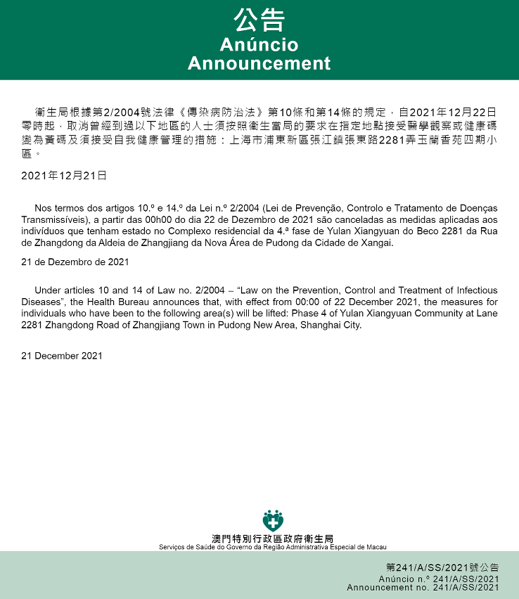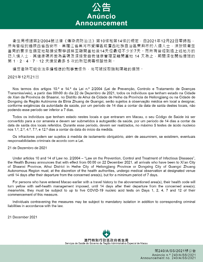 O Centro de Coordenação de Contingência do Novo Tipo de Coronavírus informa que tendo em consideração a evolução epidemiológica mais actualizada na Província de Shaanxi, na Província de Heilongjiang e na Região Autónoma da Etnia Zhuang de Guangxi, a partir das 00h00 do dia 22 de Dezembro de 2021, todos os indivíduos que tenham estado na Cidade de Xian da Província de Shaanxi, no Distrito de Aihui da Cidade de Heihe da Província de Heilongjiang ou na Cidade de Dongxing da Região Autónoma da Etnia Zhuang de Guangxi, serão sujeitos à observação médica em local a designar, conforme exigências da autoridade de saúde, por um período de 14 dias a contar da data de saída destes locais, não podendo esse período ser inferior a 7 dias.
