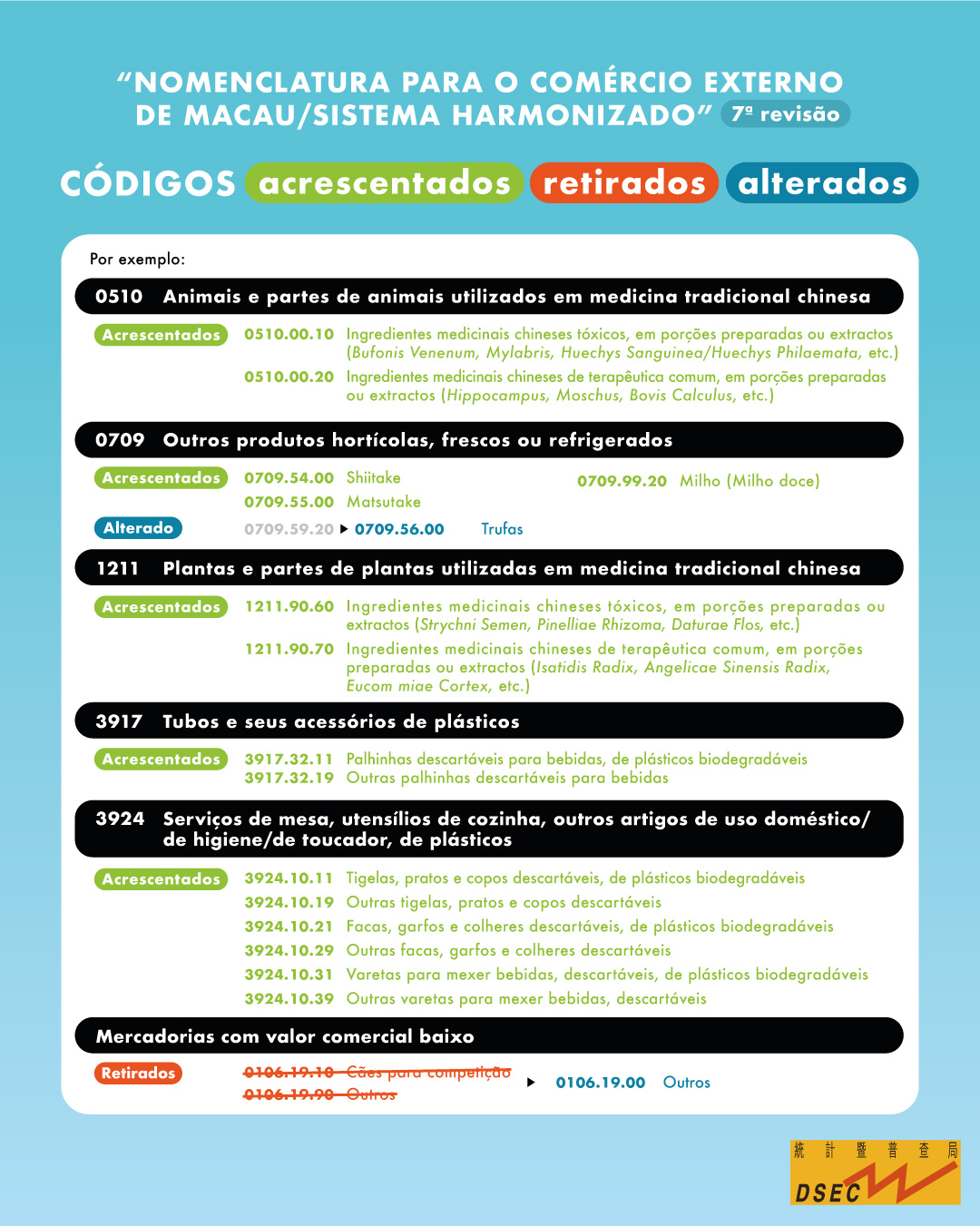 - A DSEC contactará os importadores e exportadores para os elucidar sobre o conteúdo principal desta revisão e lhes disponibilizar a tabela dos novos códigos de mercadorias mais frequentemente utilizados.