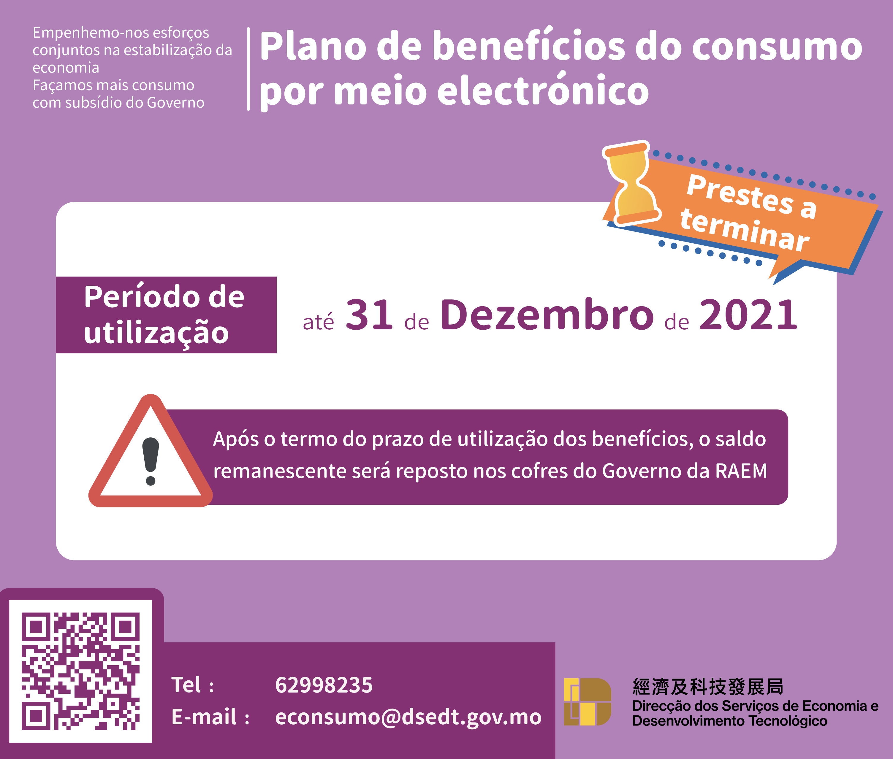 O prazo de utilização do “Plano de benefícios de consumo por meio electrónico” termina no dia 31 de Dezembro de 2021, pelo que o Governo da RAEM apela aos residentes que tenham recebido os benefícios de consumo por meio electrónico (incluindo montante inicial e montante para desconto imediato) para os utilizarem atempadamente, e o saldo remanescente não utilizado no prazo fixado será resposto nos cofres do Tesouro.