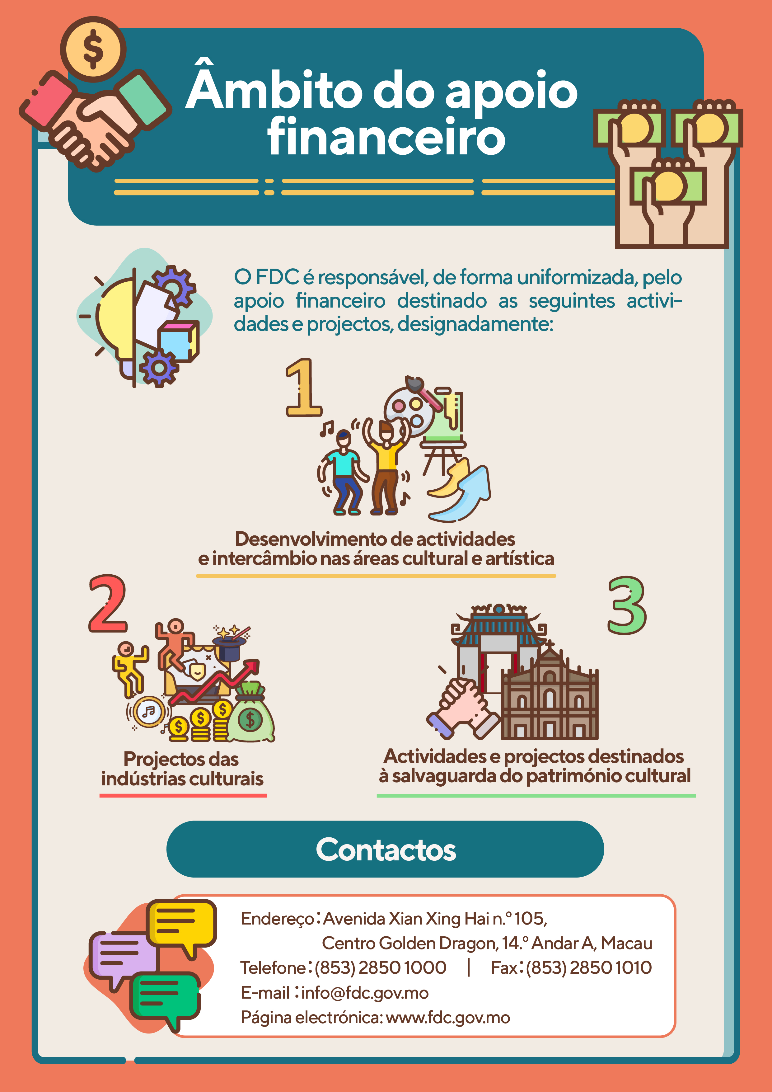 Para quaisquer esclarecimentos, é favor de contactar o FDC através do n.º de telefone, 2850 1000 ou por email, info@fdc.gov.mo.
