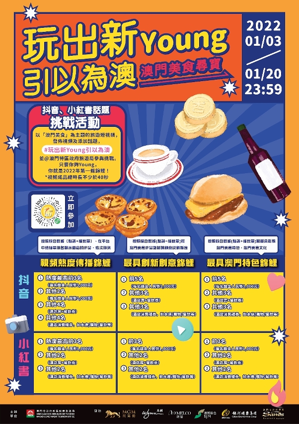 A segunda ronda do desafio de “Vídeos curtos sobre Macau” decorre de 3 a 20 de Janeiro de 2022, sob o tema de “Caça aos tesouros gastronómicos”. O passatempo convida os participantes a partilhar aspectos sobre a gastronomia de Macau através da divulgação de vídeos de turismo em formato curto no Douyin e no Xiaohongshu, acompanhados com a hashtag “#玩出新Young引以為澳#” (Vídeos curtos sobre Macau) e “@澳門特區政府旅遊局” (DST), para aderir automaticamente ao desafio e a oportunidades de receber vários prémios.