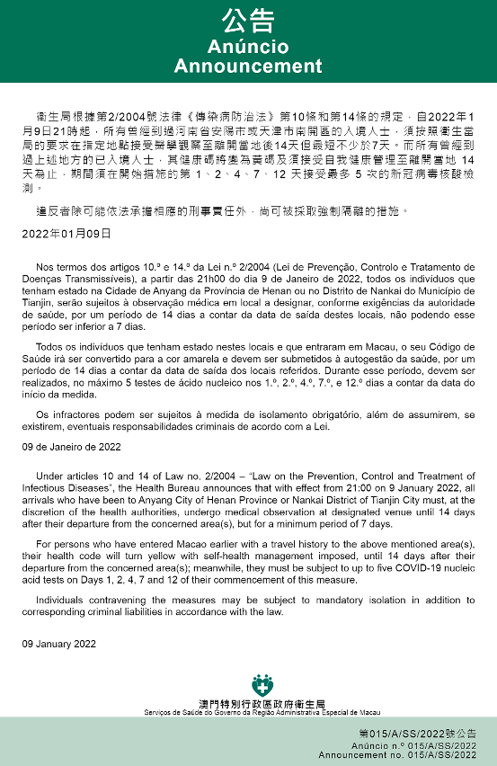 O Centro de Coordenação de Contingência do Novo Tipo de Coronavírus informa que tendo em consideração a evolução epidemiológica mais actualizada na Província de Henan e no Município de Tianjin, a partir das 21h00 do dia 9 de Janeiro de 2022, todos os indivíduos que tenham estado na Cidade de Anyang da Província de Henan ou no Distrito de Nankai do Município de Tianjin, serão sujeitos à observação médica em local a designar, conforme exigências da autoridade de saúde, por um período de 14 dias a contar da data de saída destes locais, não podendo esse período ser inferior a 7 dias.