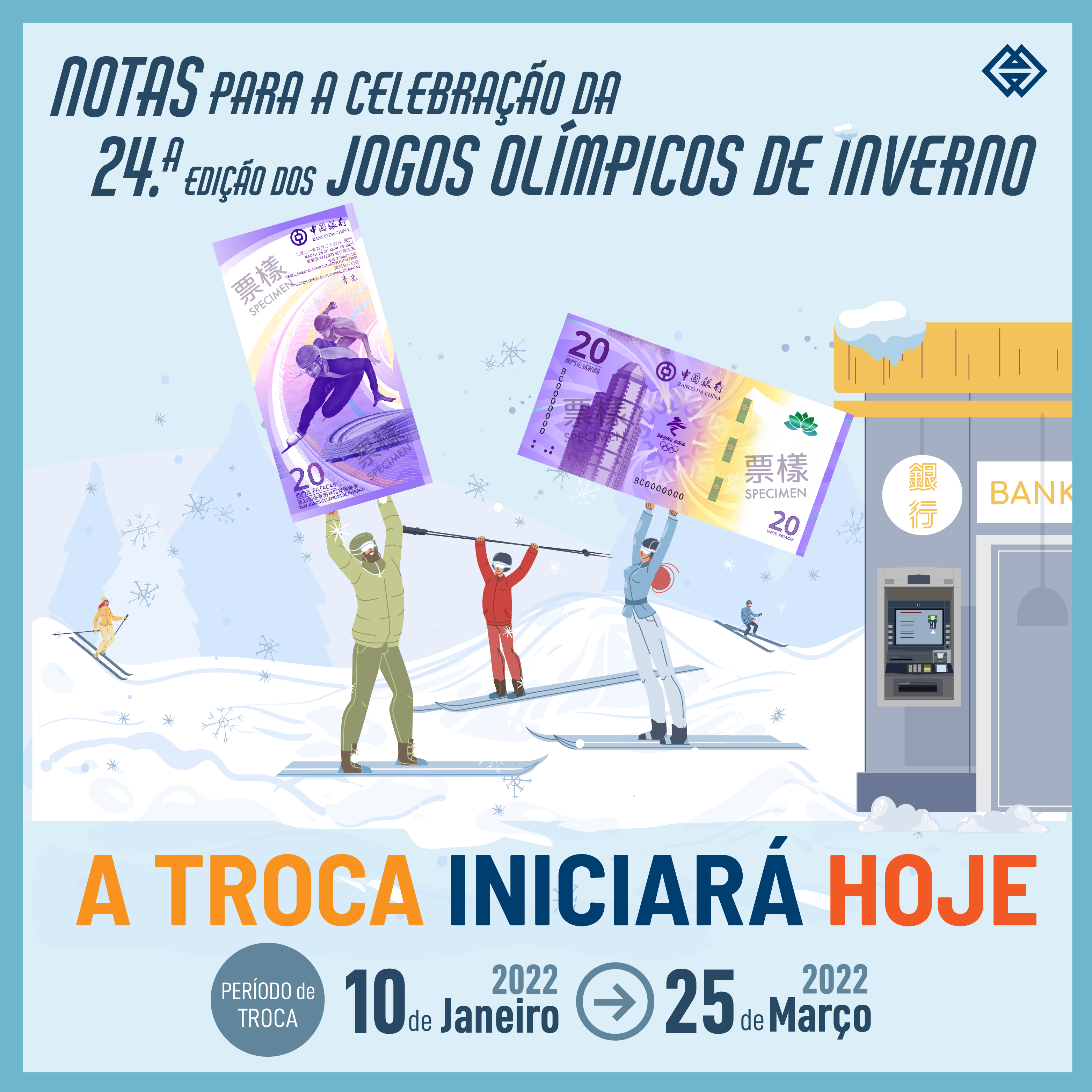 As notas para a celebração da 24ª Edição dos Jogos Olímpicos de Inverno estarão disponíveis para troca a partir de hoje (dia 10) até 25 de Março de 2022. Os residentes de Macau que efectuaram o registo para efeitos de troca devem fazer-se acompanhar do respectivo bilhete de identidade de residente e comparecer, na data previamente agendada, na agência indicada para a troca das 2 (duas) notas para a celebração da 24ª Edição dos Jogos Olímpicos de Inverno emitidas pelo Banco da China, cujo valor envolvido é de 40 patacas; podendo também designar o seu representante para o levantamento das notas, para o efeito, querendo consultar a página electrónica da AMCM para obter informações sobre os documentos exigidos.
