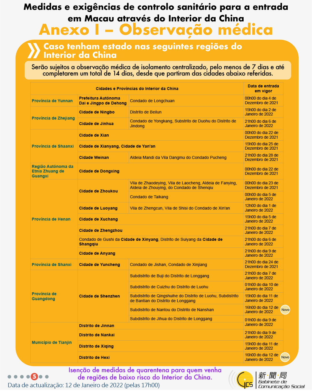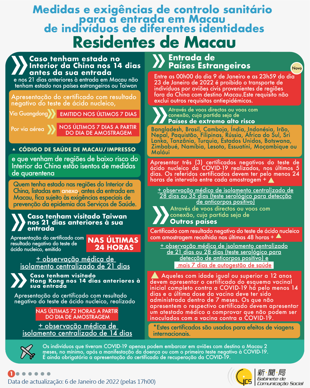(Infografia)Medidas e exigências de controlo sanitário para a entrada em Macau de indivíduos de diferentes identidades, actualizadas no dia 12 de Janeiro de 2022