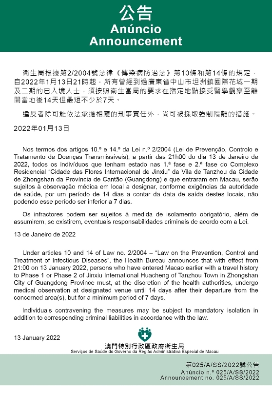 O Centro de Coordenação de Contingência do Novo Tipo de Coronavírus informa que tendo em consideração a evolução epidemiológica mais actualizada na Província de Cantão (Guangdong), os Serviços de Saúde, de acordo com os dispostos nos artigos 10.º e 14.º da Lei n.º 2/2004 (Lei de Prevenção, Controlo e Tratamento de Doenças Transmissíveis), determinam que a partir das 21h00 do dia 13 de Janeiro de 2022, todos os indivíduos que tenham estado nas 1.ª fase e 2.ª fase do Complexo Residencial “Cidade das Flores Internacional de Jinxiu” da Vila de Tanzhou da Cidade de Zhongshan da Província de Cantão (Guangdong) e que entraram em Macau, serão sujeitos à observação médica em local a designar, conforme exigências da autoridade de saúde, por um período de 14 dias a contar da data de saída destes locais, não podendo esse período ser inferior a 7 dias.