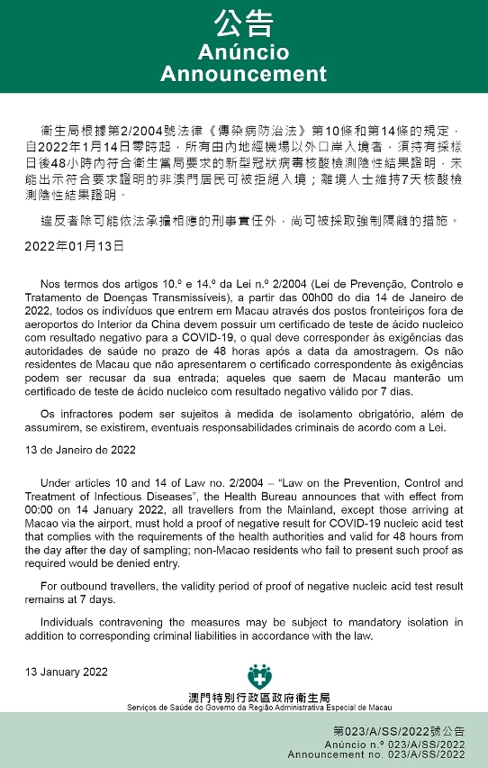 O Centro de Coordenação de Contingência do Novo Tipo de Coronavírus informa que tendo em consideração as necessidades de prevenção e controlo de epidemia, os Serviços de Saúde, de acordo com os dispostos nos artigos 10.º e 14.º da Lei n.º 2/2004 (Lei de Prevenção, Controlo e Tratamento de Doenças Transmissíveis), determinam que a partir das 00h00 do dia 14 de Janeiro de 2022, todos os indivíduos que entrem em Macau através dos postos fronteiriços, excepto aeroportos do interior da China, devem possuir um certificado de teste de ácido nucleico com resultado negativo para a COVID-19, o qual deve corresponder às exigências das autoridades de saúde no prazo de 48 horas após a data da amostragem.