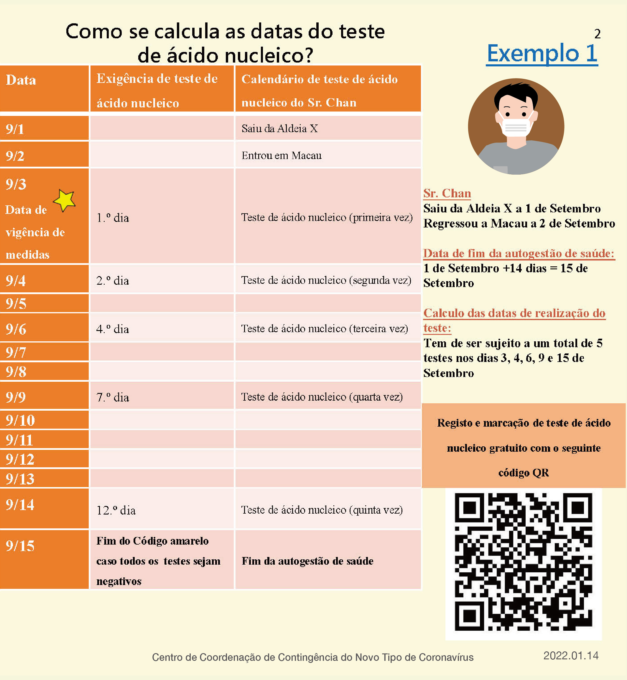 - Datas de realização de teste de ácido nucleico: A partir da data de vigência das medidas, precisa de ser sujeito até a 5 testes de ácido nucleico de novo tipo de coronavírus nos 1.º, 2.º, 4.º, 7.º e 12.º dias do período de autogestão da saúde, ou seja, as medidas entraram em vigor em 14 de Janeiro, um total de 5 testes de ácido nucleico serão realizados nos dias 14, 15, 17, 20 e 25 de Janeiro. No caso de saída do local relevante no dia 1 de Janeiro, a autogestão da saúde será realizada até 15 de Janeiro, ou seja, apenas um total de 2 testes de ácido nucleico devem ser realizados nos dias 14 e 15 de Janeiro.