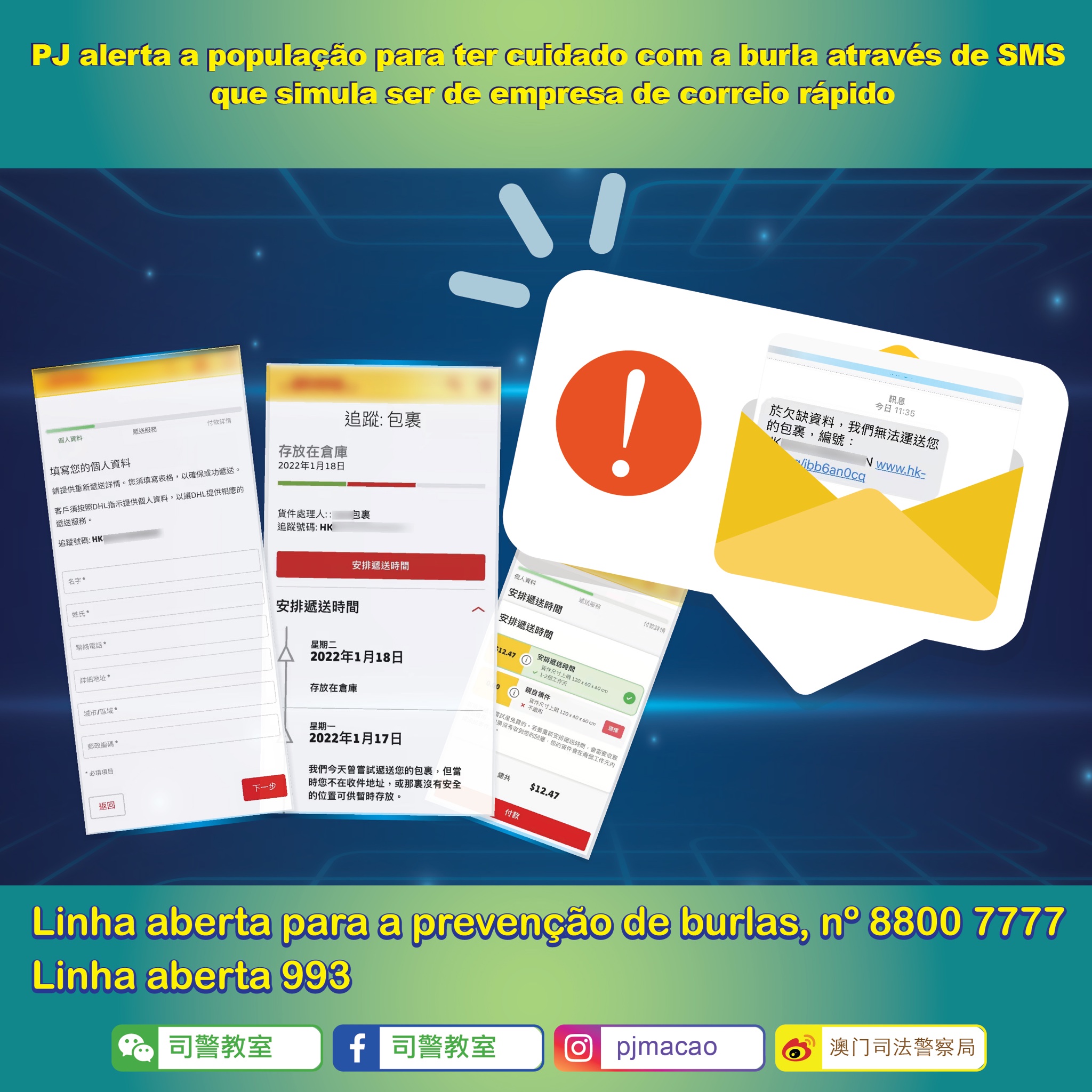 Tendo em conta que burlas semelhantes já ocorreram em Macau anteriormente e causaram prejuízos, a PJ apela aos cidadãos para estarem sempre atentos, terem cuidado com os criminosos que procuram oportunidades para obter informações pessoais e os defraudarem em dinheiro. Caso alguém receba SMS deste género, deve ficar atento e confirmar a mesma através de meio confiável.