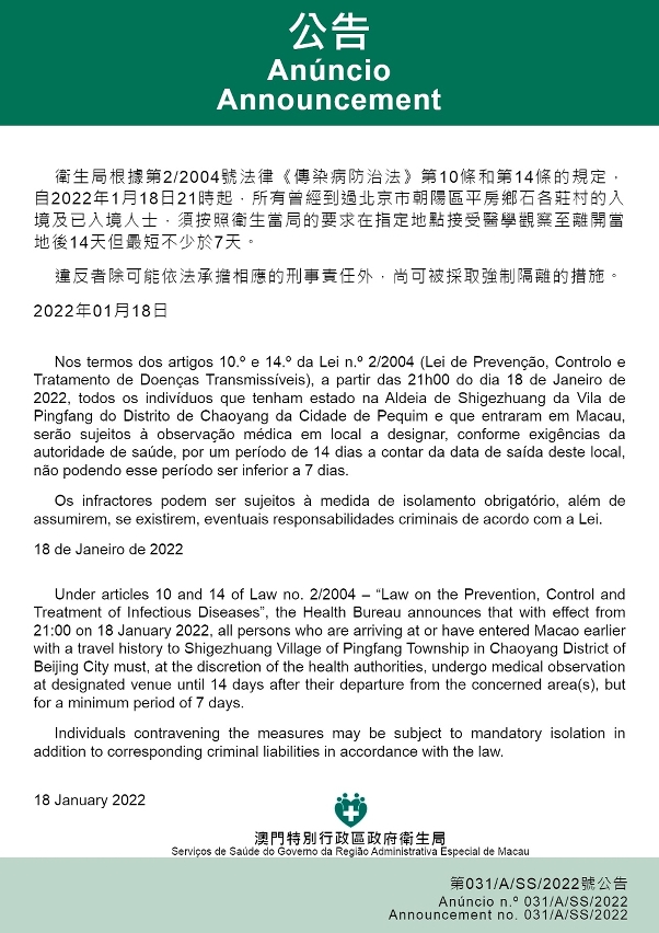 | Toda a zona da Aldeia de Guangsheng, Complexo Residencial “Rongyuan” de Jiangjunshan, Bloco 129 da 4.ª fase do Complexo Residencial “Huafa New Town” e Complexo Residencial “Jardim Chengfeng” da Aldeia de Shi’er da Vila de Nanping do Distrito de Xiangzhou (já entraram em Macau) |