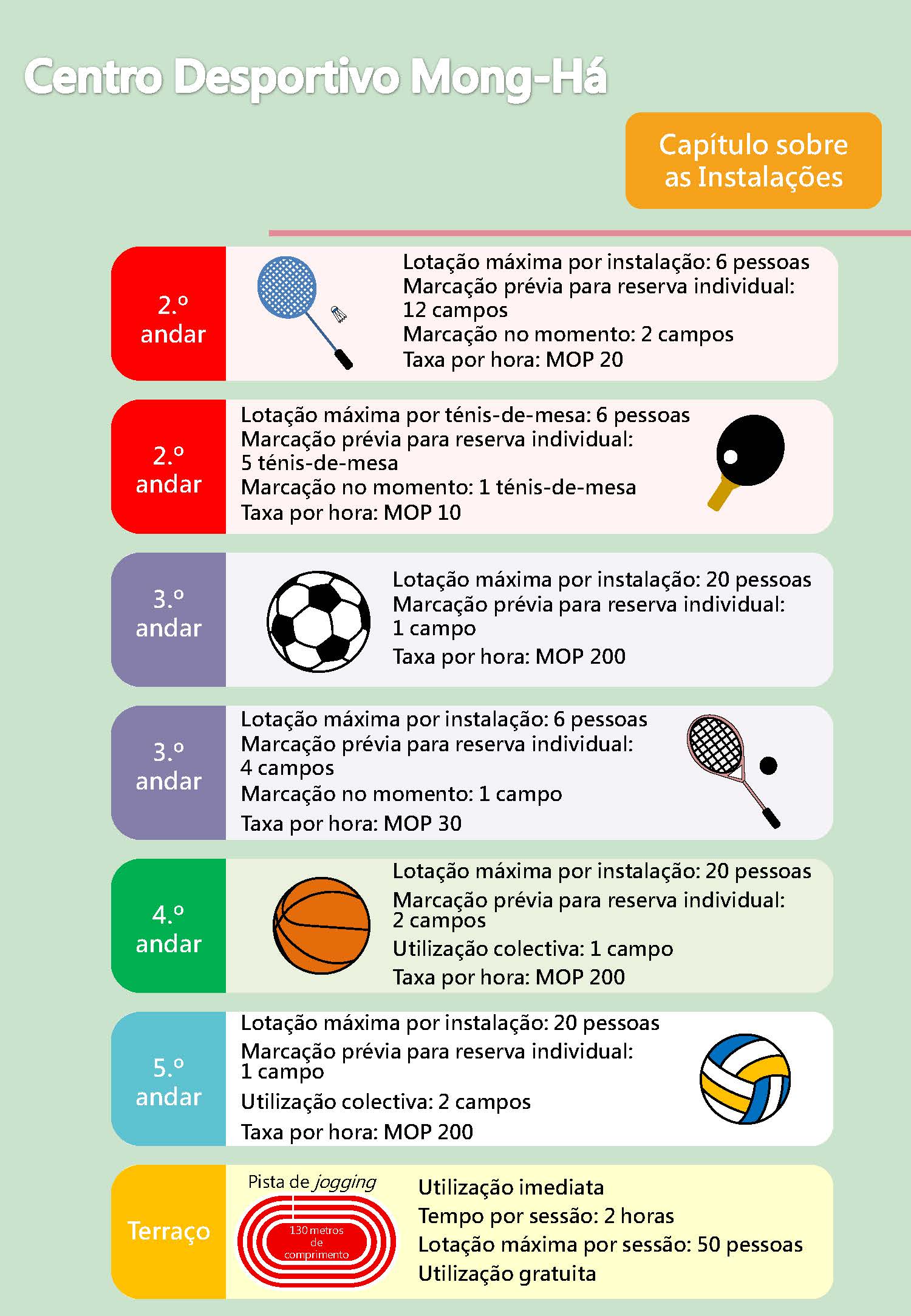 Em resposta às necessidades da população no âmbito das instalações desportivas, a partir de 26 de Janeiro do corrente ano, as instalações desportivas do Centro Desportivo Mong-Há, nomeadamente os Campos de futsal e de squash do 3.o andar e os Campos de voleibol do 5.o andar, serão abertas ao público e o horário de funcionamento das instalações desportivas atrás mencionadas e das abertas na primeira fase, nomeadamente os Campos de badminton, de ténis-de-mesa e de basquetebol e a pista de jogging da Zona desportiva e de lazer do terraço é de 2.a feira a domingo, das 08.00 horas às 22.00 horas. Neste sentido, a partir das 08.30 horas de 25 de Janeiro, os residentes podem efectuar a marcação com a antecedência das instalações desportivas abertas na presente fase e os sócios do Plano de Sócio “Sport Easy” podem aceder à página electrónica ou à aplicação de telemóvel do Instituto do Desporto para efectuar a marcação das instalações desportivas com a antecedência de 7 dias ou aguardar presencialmente na fila para comprar o bilhete no dia 26 de Janeiro.