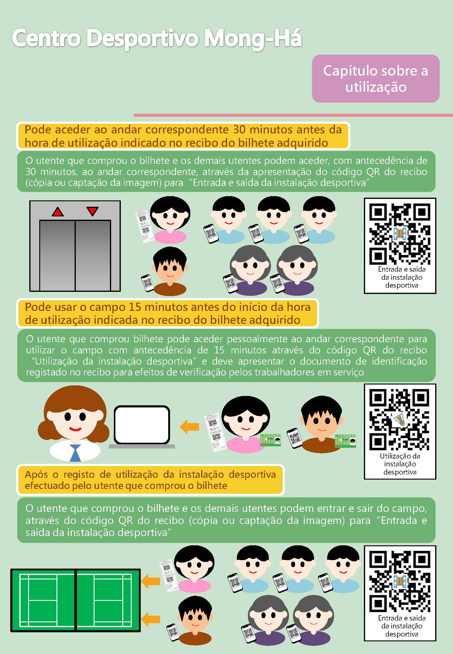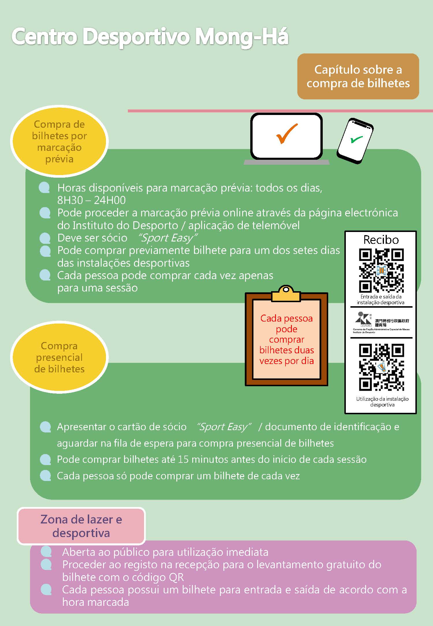 O Centro Desportivo Mong-Há tem 5 andares, diferentes instalações desportivas estão localizadas em diferentes andares e são principalmente as modalidades desportivas mais procuradas pelo público, tendo em vista proporcionar aos residentes espaços para a prática de diferentes desportos e promover o estilo de vida saudável através da prática desportiva ao longo da vida junto da população em geral. Para facilitar os residentes a melhor organizarem os seus planos de prática de exercícios físicos, a utilização das instalações desportivas do Centro é efectuada essencialmente através da compra de bilhetes por via electrónica. Por outro lado, para efeitos de prevenção da pandemia, o Centro vai restringir o número de pessoas que terá acesso às instalações desportivas, por forma a evitar a grande aglomeração de pessoas, pelo que, se solicitam aos residentes a efectuarem as marcações com a maior brevidade possível. Após a marcação com sucesso das instalações desportivas do Centro, ao utente que comprou o bilhete é emitido o recibo da compra do bilhete com dois códigos QR, devendo o qual aceder ao andar correspondente 30 minutos antes do início da hora de utilização indicado em um dos códigos QR “entrar e sair da instalação desportiva” e efectuar pessoalmente o registo 15 minutos antes do início da hora de utilização através da apresentação do segundo código QR “utilização da instalação desportiva” e do documento de identificação registado no recibo para efeitos de verificação pelo pessoal em serviço no Centro. Findos os procedimentos atrás mencionados, o utente que comprou o bilhete e os demais utentes podem aceder à instalação desportiva através da apresentação do código QR “entrar e sair da instalação desportiva” (cópia ou gravação da imagem).