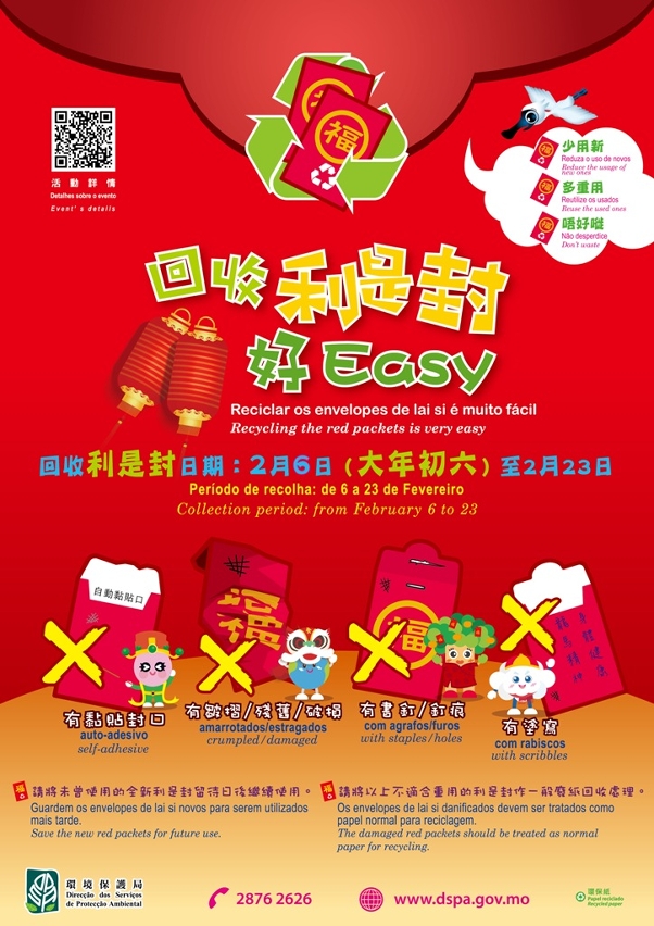 Ao mesmo tempo, para estimular a redução de resíduos a partir da fonte, a DSPA continua a realizar a actividade “É Muito Fácil Recolher Envelopes de “Lai Si”” durante o Ano Novo Chinês, divulgando a ideia amiga do ambiente: “reduza o uso de novos, reutilize os usados, não desperdice”. Os envelopes de “lai si” usados encontrar-se-ão disponíveis em 57 pontos, distribuídos pelos seguintes locais: DSPA, Centros Ambientais Alegria, União Geral das Associações dos Moradores de Macau, FAOM, Associação Geral das Mulheres de Macau, Aliança de Povo de Instituição de Macau, Cáritas de Macau, Associação de Nova Juventude Chinesa de Macau, Associação de Reabilitação Fu Hong de Macau e Macao Association of Social and Livelihood Enhancement, entre outros. Paralelamente, no período entre 6 de Fevereiro (sexto dia do primeiro mês lunar) e 23 de Fevereiro de 2022 continuarão a estar disponíveis os pontos de recolha de envelopes de “lai si”, estabelecidos em cooperação entre a DSPA e os serviços públicos, associações, hotéis, bancos, escolas, estabelecimentos comerciais e edifícios habitacionais, entre outros. Para mais informações, queira por favor consultar a página electrónica da DSPA http://www.dspa.gov.mo/redpacketrecycling.aspx.