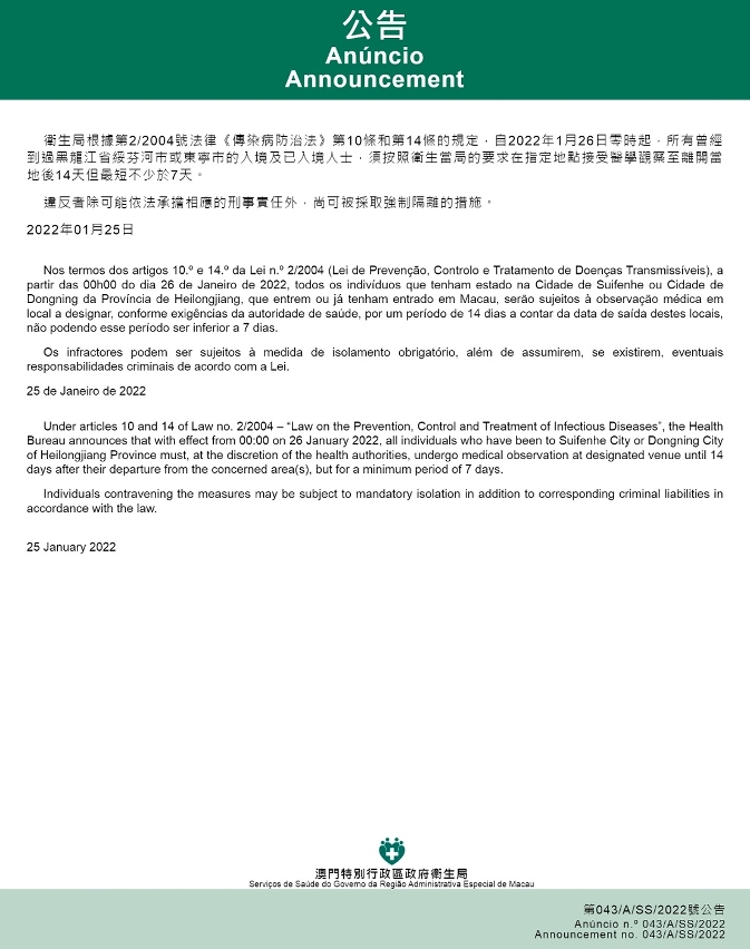 Cidade de Suifenhe (incluindo aqueles que já entraram em Macau) |