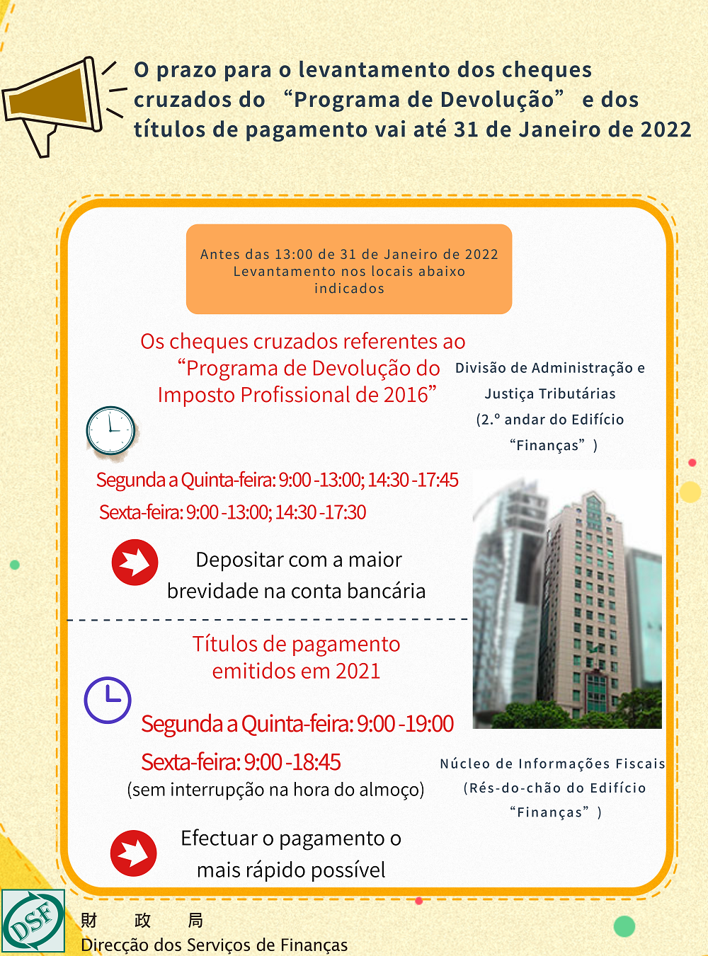O prazo para o depósito junto ao banco do cheque cruzado do “Programa de Devolução do Imposto Profissional de 2016” vai até ao dia 31 de Janeiro do corrente ano. A Direcção dos Serviços de Finanças apela aos contribuintes que ainda não o tenham feito para, o mais tardar, efectuarem o levantamento dos cheques, antes das 13:00 horas, do dia 31 de Janeiro, na Divisão de Administração e Justiça Tributárias sita no 2.º andar do Edifício “Finanças”, dentro das horas de expediente (de manhã, das 9:00 às 13:00; de tarde, das 14:30 às 17:45, de Segunda a Quinta-feira; e das 14:30 às 17:30, à Sexta-feira), findo do prazo legalmente estipulado, ficam sem direito à restituição.