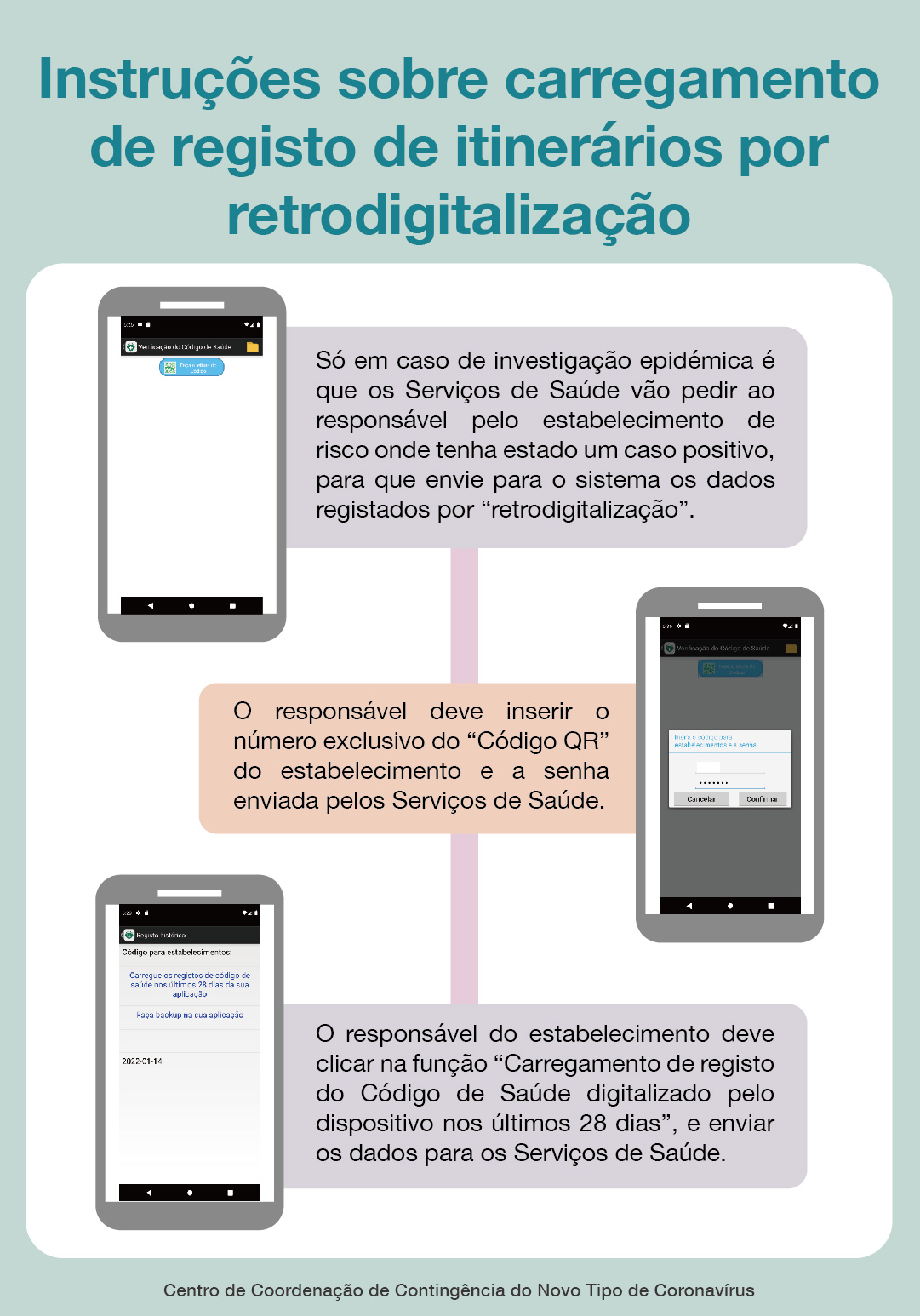 Em caso de investigação epidémica, os Serviços de Saúde vão pedir ao responsável pelo estabelecimento de risco onde o portador de caso positivo esteve, que envie aos Serviços de Saúde os dados registados por“retrodigitalização”. O responsável, nessas situações, deve inserir o número exclusivo do “Código QR” do estabelecimento e a senha enviada pelos Serviços de Saúde e clicar na função de “Carregamento de registo do Código de Saúde digitalizado pelo dispositivo nos últimos 28 dias”, enviar a informação para os Serviços de Saúde.