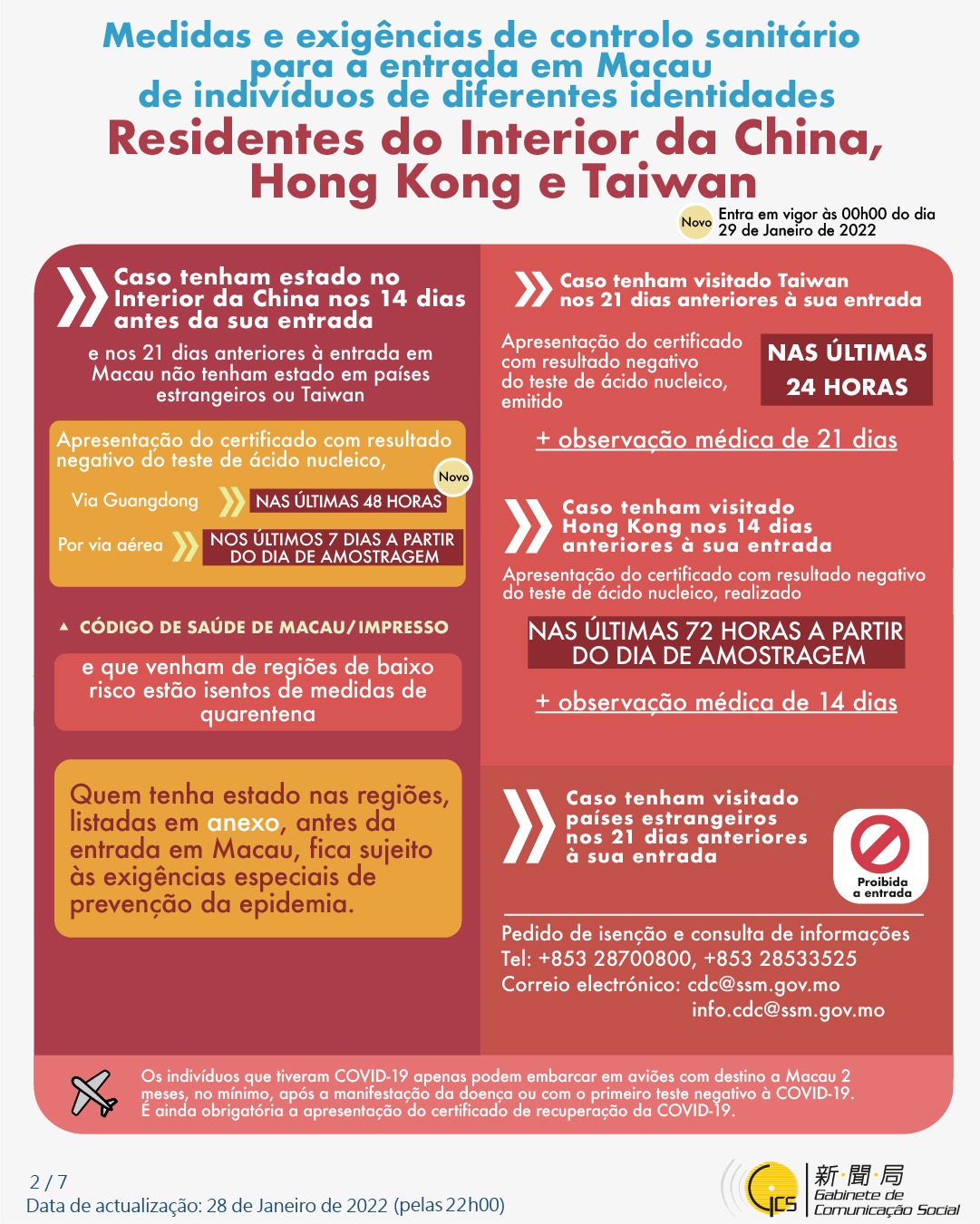 (Infografia)Medidas e exigências de controlo sanitário para a entrada em Macau de indivíduos de diferentes identidades, actualizadas no dia 28 de Janeiro de 2022