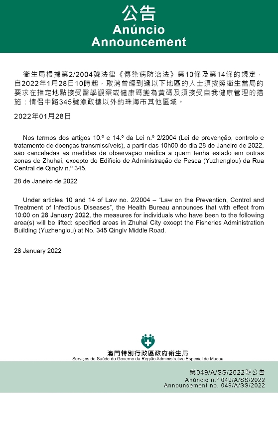 Rua de Yuyuan n.º 228 do Subdistrito de Jingansi (incluindo aqueles que já entraram em Macau) |