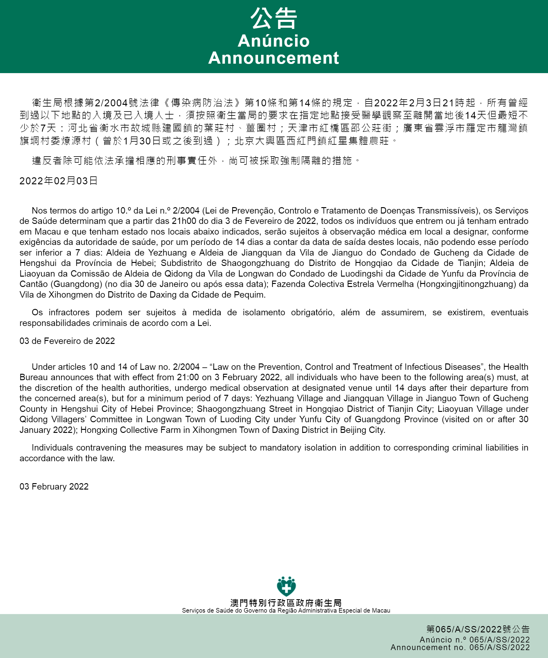 Outras áreas do Distrito de Baoan (excluindo os indivíduos que passam pelo Distrito de Baoan para ida e volta do aeroporto ou terminal de passageiros) |