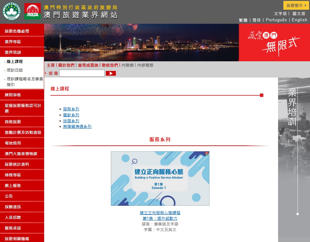 Os vídeos de formação da série “Construir uma mentalidade de serviço positiva”, incluem temas como Incentivar a Produtividade, Capacidade de Serviço Impressionante, Construir uma Atitude Optimista, entre outros. O conteúdo de aprendizagem é leccionado pelo formador local, Hui Kwok Kit, detentor de mais de 20 anos de experiência em formação, que criará diferentes cenários para apresentar cada tema. Os destinatários são os operadores turísticos, incluindo hotéis, restauração, venda a retalho, agências de viagens, guias turísticos, e empresas do “Programa de Avaliação de Serviços Turísticos de Qualidade”.