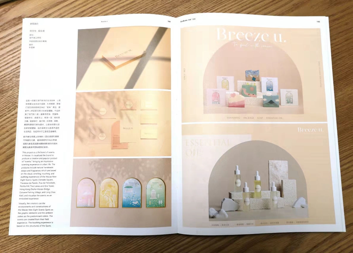 O trabalho premiado “Breeze u.”, de Choi Ian I e Wu Yuyi, representa uma marca de aromas com temas associados aos diversos cheiros de Macau. A obra combina os elementos de visão, olfacto, tacto e audição recolhidos nas “Oito Novas Paisagens de Macau” (Largo do Senado, Travessa da Paixão, Rua da Felicidade, Colina de Penha, Dois Lagos e Uma Torre, Ponte Hong Kong-Zhuhai-Macau, Vila de Pescadores de Coloane, e Long Chao Kok), no intuito de combinar a experiência multi-sensorial com a visualização do cheiro e a partir daí criar produtos de aroma para uso quotidiano com características culturais e criativas, por exemplo aromaterapias e sabonetes naturais manufacturados. Através da pesquisa de campo, em termos visuais, as duas alunas adoptaram como elementos gráficos o ambiente e a arquitectura das “Oito Novas Paisagens de Macau”, usando a cor do ambiente como tom principal; quanto ao aspecto de olfacto, reproduziram os cheiros locais através do seu próprio sentimento in loco; e em relação ao tacto, tomaram como referência a textura arquitectónica das referidas paisagens para a integrar nos elementos de design.