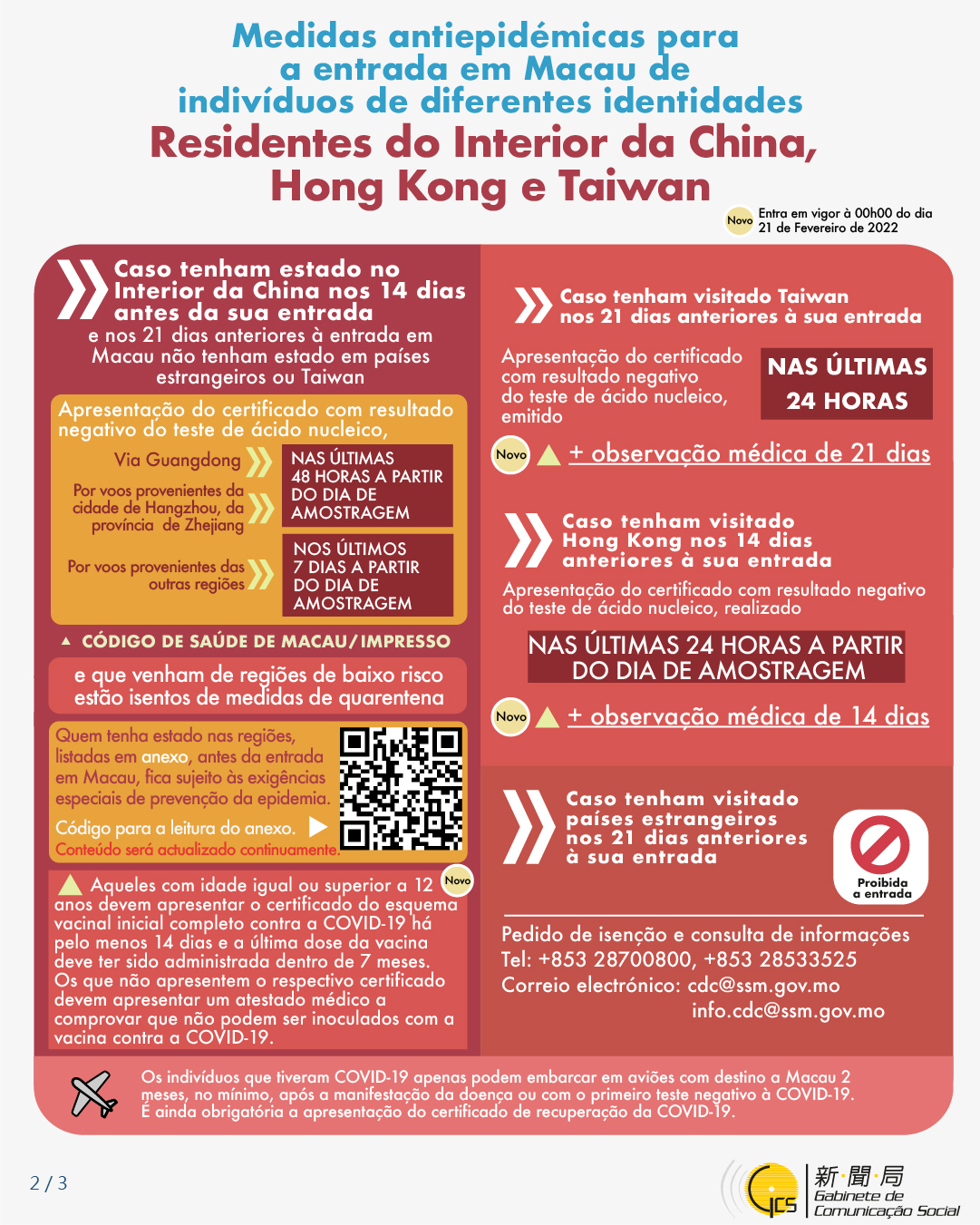 (Infografia)Medidas antiepidémicas para a entrada em Macau de indivíduos de diferentes identidades, actualizadas no dia 16 de Fevereiro de 2022