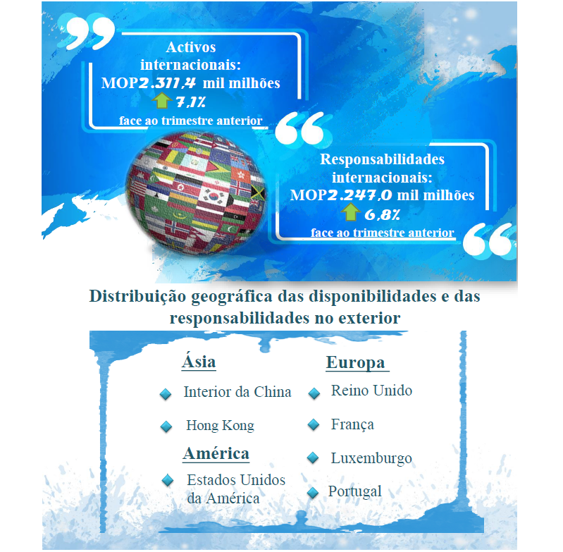 A actividade bancária internacional de Macau distribuiu-se principalmente pela Ásia, América e Europa. Até final de Dezembro de 2021 as quotas das disponibilidades do sistema bancário de Macau no Interior da China e em Hong Kong, foram de 42,3% e 28,2%, respectivamente; em relação os Estados Unidos da América foram de 4,5%, enquanto que em relação ao Luxemburgo e a Portugal, estas quotas foram de 1,0% e 0,7%, respectivamente, no total de activo exterior. Entretanto, as quotas das disponibilidades nos países de língua portuguesa e nos países localizados ao longo da iniciativa “Uma Faixa, Uma Rota” ocuparam 1,1% e 8,8%, respectivamente. Quanto ao passivo sobre o exterior, registaram quotas de 45,2% e 32,7% para o Interior da China e Hong Kong, respectivamente; no que respeita ao passivo sobre o Reino Unido e a França, as suas quotas foram de 4,5% e 3,1% do total de passivo sobre o exterior. Relativamente aos países de língua portuguesa e aos países localizados ao longo da iniciativa “Uma Faixa, Uma Rota” registaram quotas de 0,5% e 7,8%, respectivamente.