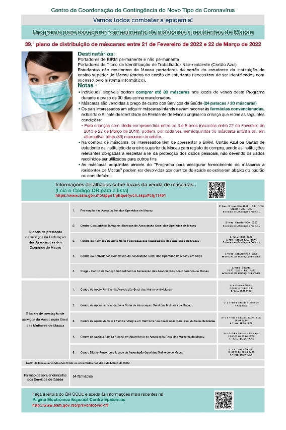 O Centro de Coordenação de Coordenação de Contingência do Novo Tipo de Coronavírus informa que no próximo dia 21 de Fevereiro, segunda-feira, terá início o 39.º Plano de fornecimento de máscaras destinado aos residentes de Macau. O período de venda irá decorrer durante 30 dias, entre 21 de Fevereiro de 2022 e 22 de Março de 2022.