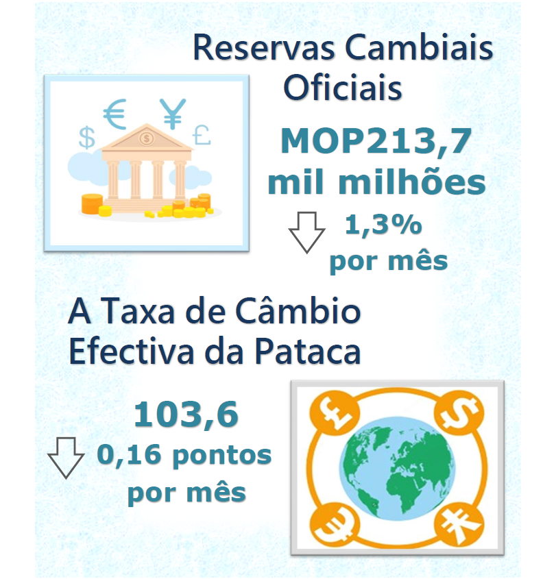 A taxa de câmbio efectiva da pataca, ponderada pelas suas quotas do comércio, foi de 103,6 em Fevereiro de 2022, registaram decrescimento de 0,16 pontos e crescimento de 1,47 pontos, respectivamente, sobre os dados do mês anterior e relativos a Fevereiro de 2021, implicando que globalmente, a pataca caiu mensalmente face às moedas dos principais parceiros comerciais de Macau, mas subiu anualmente.