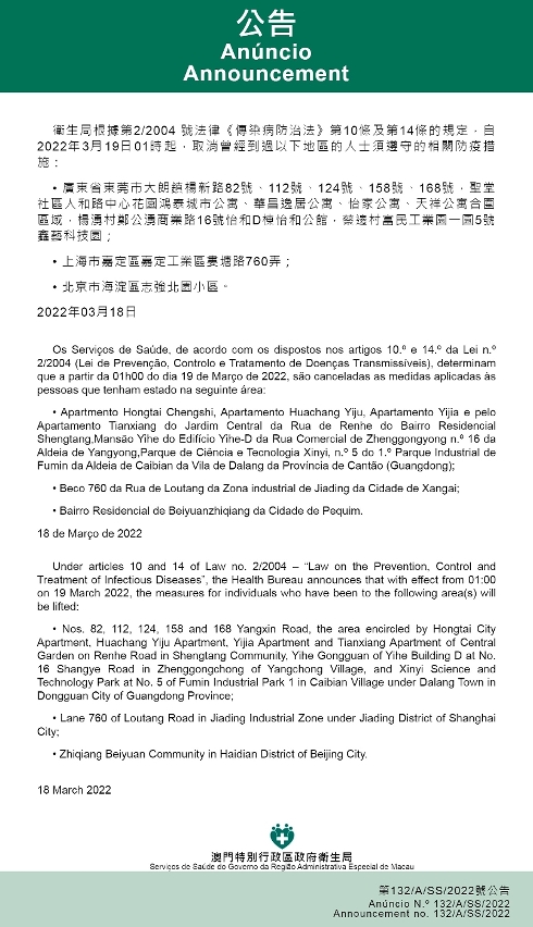 Anuncia-se, ainda, que a partir da 01h00 do dia 19 de Março de 2022, foram canceladas as medidas aplicadas às pessoas que tenham estado nas seguintes áreas devem observar as respectivas medidas antiepidémicas: N.º 82, Nº. 112, No. 124, No. 158, No. 168 da Rua Yangxin da Aldeia Dalang, Área circundada pelo Apartmento Hongtai Chengshi, Apartamento Huachang Yiju, Apartamento Yijia e pelo Apartamento Tianxiang do Jardim Central da Rua de Renhe do Bairro Residencial Shengtang,Mansão Yihe do Edifício Yihe-D da Rua Comercial de Zhenggongyong n.º 16 da Aldeia de Yangyong,Parque de Ciência e Tecnologia Xinyi, n.º 5 do 1.º Parque Industrial de Fumin da Aldeia de Caibian da Vila de Dalang da Província de Cantão (Guangdong); Beco 760 da Rua de Loutang da Zona industrial de Jiading da Cidade de Xangai; Bairro Residencial de Beiyuanzhiqiang da Cidade de Pequim.