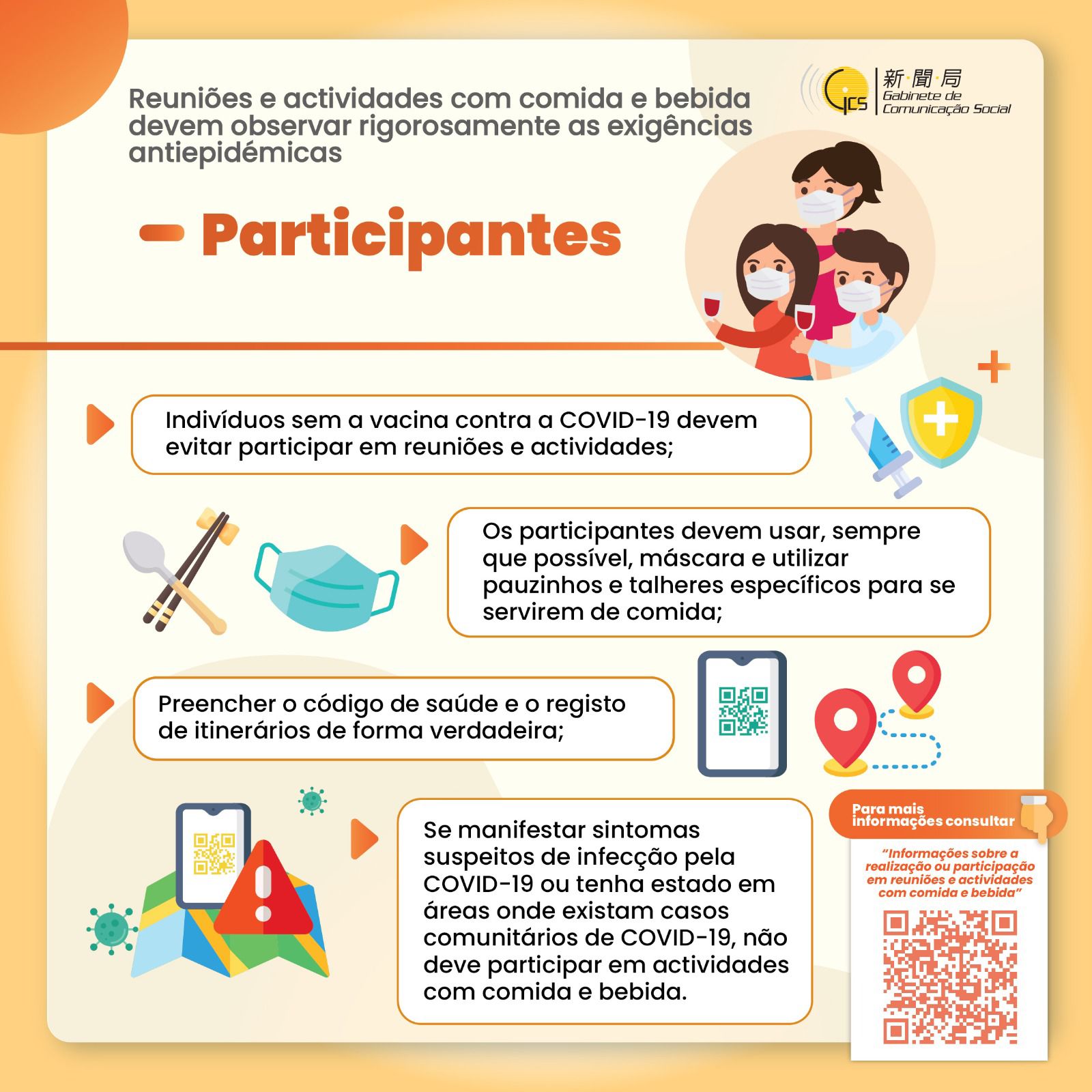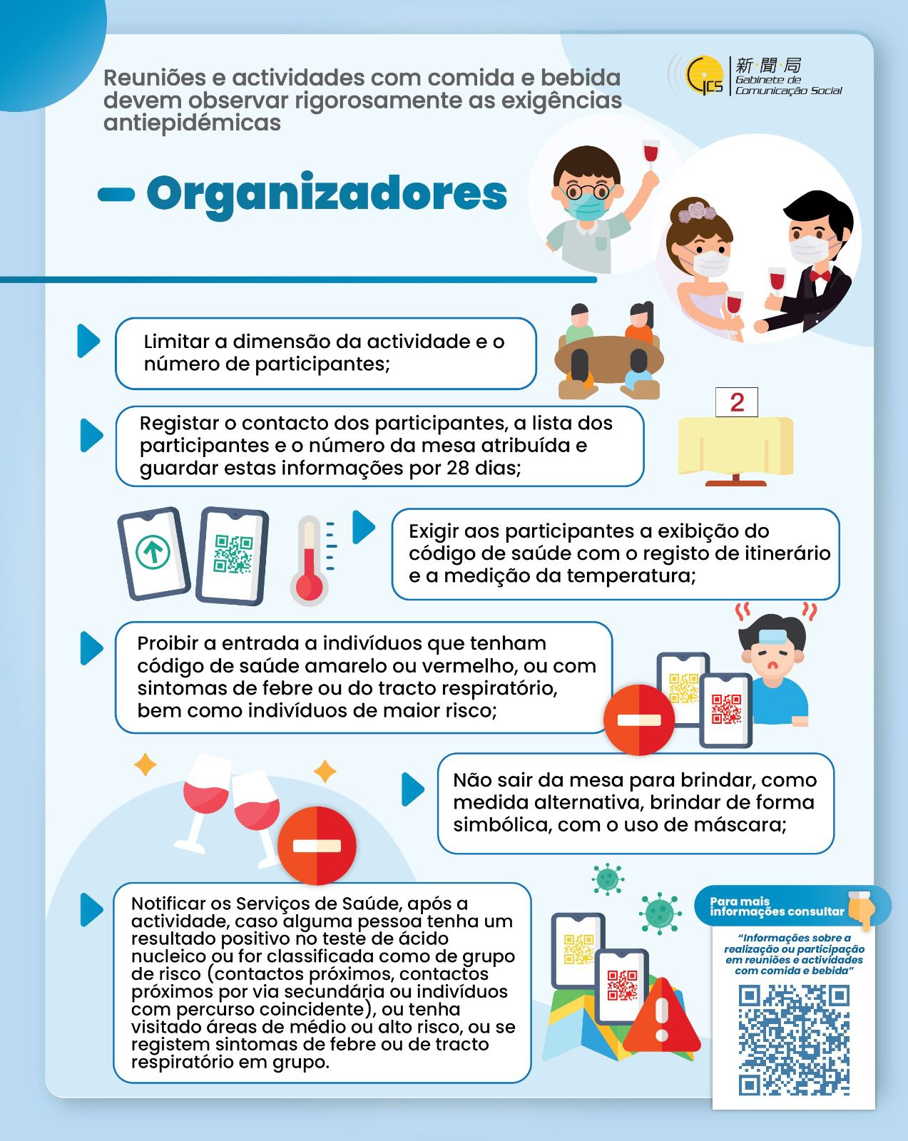 • Reuniões e actividades com comida e bebida devem observar rigorosamente as exigências antiepidémicas