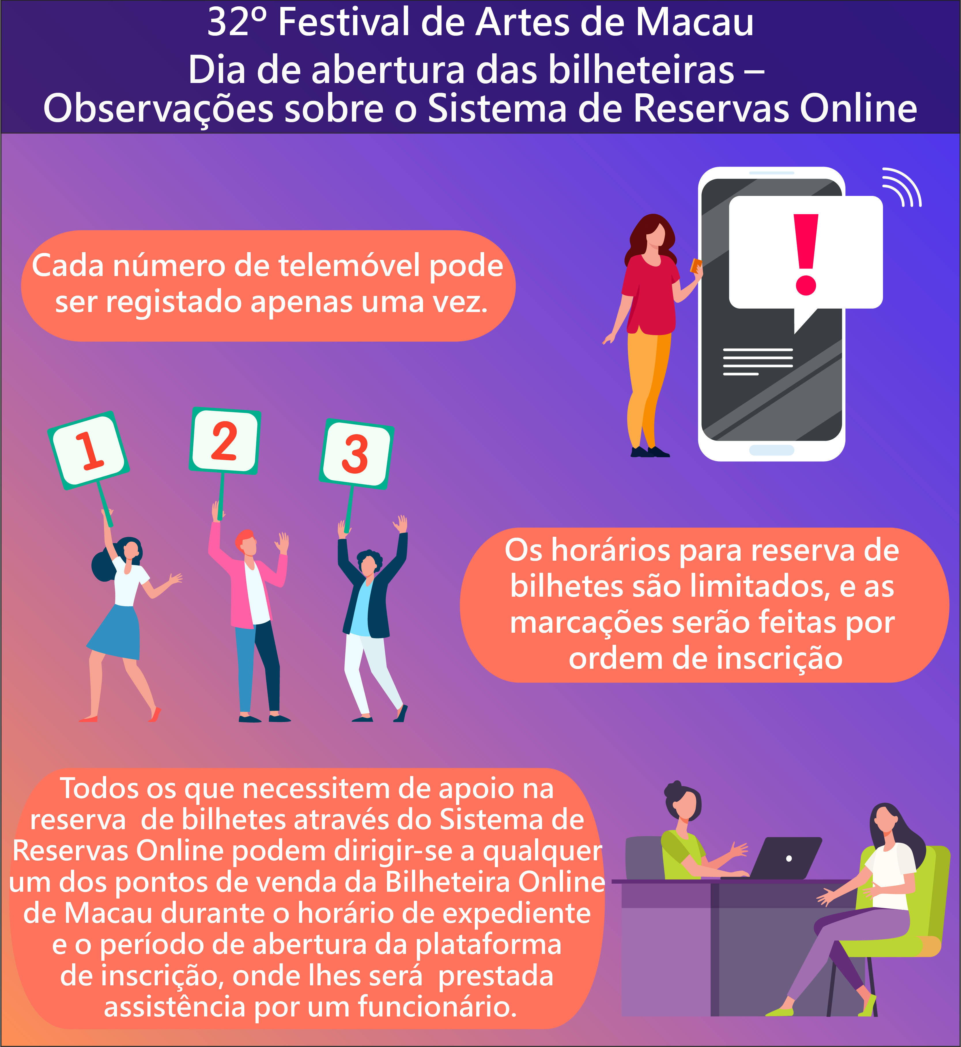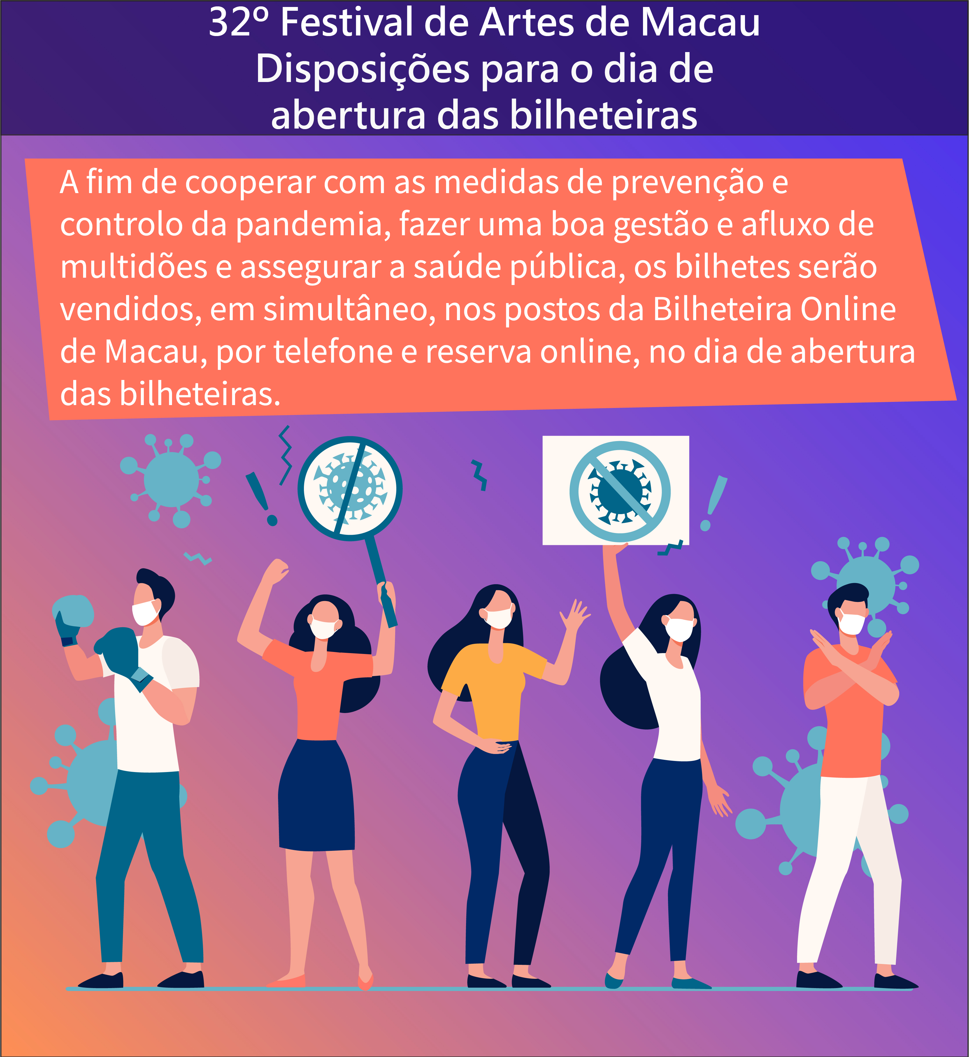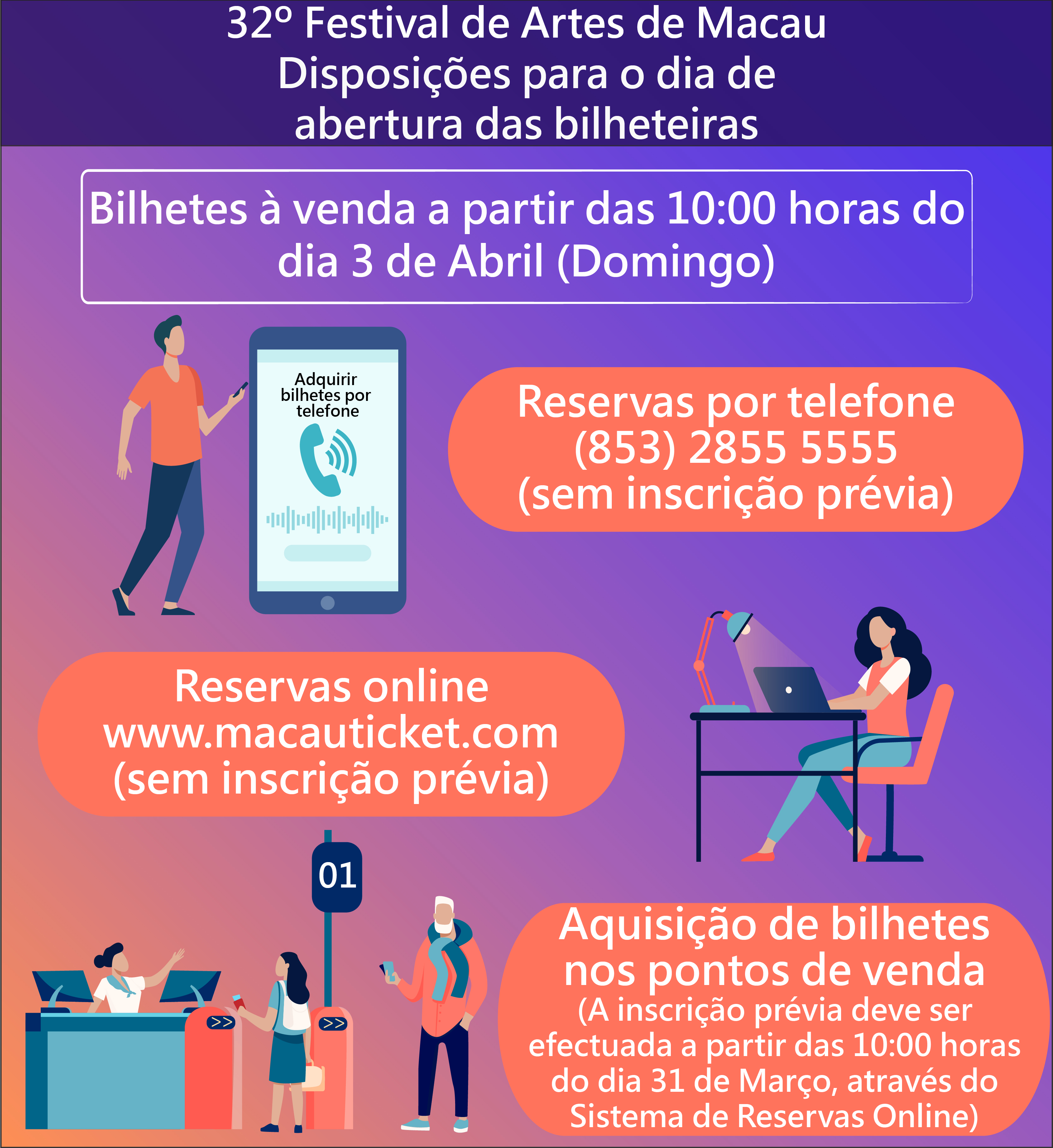 O 32.º Festival de Artes de Macau (FAM), organizado pelo Instituto Cultural (IC), decorrerá entre 29 de Abril e 2 de Junho. Os bilhetes para os espectáculos e parte do programa do Festival Extra estarão disponíveis a partir das 10:00 horas do dia 3 de Abril (Domingo), na Bilheteira Online de Macau. Por forma a colaborar com os trabalhos de prevenção da pandemia e a assegurar a saúde dos residentes, no dia de abertura das bilheteiras, os bilhetes estarão disponíveis simultaneamente nos postos de venda da Bilheteira Online de Macau, por telefone e por reserva online. Além disso, com o intuito de reduzir a aglomeração de multidões na aquisição presencial de bilhetes, os membros do público são aconselhados a reservar os bilhetes online ou por telefone, estando disponível ainda o Sistema de Reservas Online para o dia de abertura das bilheteiras. Os membros do público que pretendam comprar bilhetes pessoalmente nos balcões no dia de abertura das bilheteiras, entre as 10:00 horas e as 13:00 horas, devem efectuar a respectiva inscrição no referido sistema, a partir das 10:00 horas do dia 31 de Março (Quinta-feira).