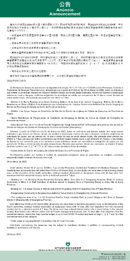 Também, a partir da 01h00 do dia 30 de Março de 2022, todos os indivíduos que tenham estado nos locais abaixo indicados e que entrem em Macau, devem ser sujeitos à observação médica em local a designar, conforme exigências da autoridade de saúde, por um período de 14 dias a contar da data de saída destes locais, não podendo esse período ser inferior a 7 dias; por sua vez, todos os indivíduos que tenham estado nestes locais e que entraram em Macau, o seu Código de Saúde irá ser convertido para a cor amarela e esses indivíduos devem ser submetidos à autogestão da saúde, por um período de 14 dias a contar da data de saída desses locais. Durante esse período, devem ser realizados, no máximo 5 testes de ácido nucleico nos 1.º, 2.º, 4.º, 7.º, e 12.º dias a contar da data do início da medida: Outras áreas do Distrito de Licheng da Cidade de Quanzhou da Província de Fujian.