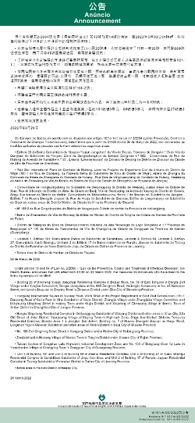 Tendo em consideração a evolução epidemiológica mais actualizada no Interior da China, os Serviços de Saúde, de acordo com os dispostos nos artigos 10.º e 14.º da Lei n.º 2/2004 (Lei de Prevenção, Controlo e Tratamento de Doenças Transmissíveis), determinam que a partir da 01h00 do dia 30 de Março de 2022, todos os indivíduos que entrem ou já tenham entrado em Macau e tenham estado nos locais abaixo indicados, devem ser sujeitos à observação médica em local a designar, conforme exigências da autoridade de saúde, por um período de 14 dias a contar da data de saída destes locais, não podendo esse período ser inferior a 7 dias: