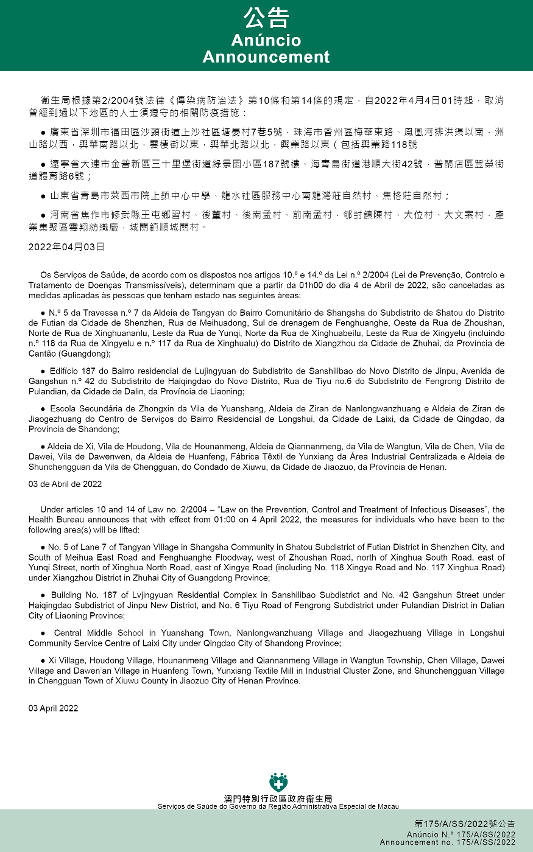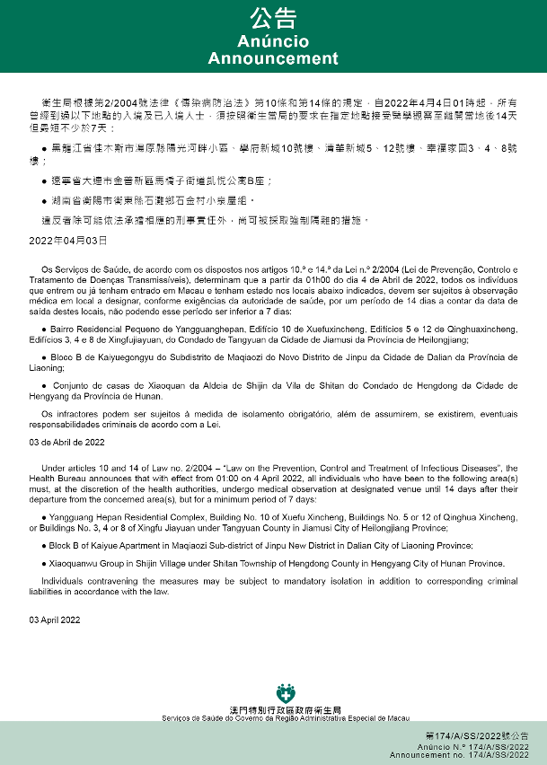 Tendo em consideração a evolução epidemiológica mais actualizada no Interior da China, os Serviços de Saúde, de acordo com os dispostos nos artigos 10.º e 14.º da Lei n.º 2/2004 (Lei de Prevenção, Controlo e Tratamento de Doenças Transmissíveis), determinam que desde as 01h00 do dia 4 de Abril de 2022, todos os indivíduos que entrem ou já tenham entrado em Macau e tenham estado nos locais abaixo indicados, devem ser sujeitos à observação médica em local a designar, conforme exigências da autoridade de saúde, por um período de 14 dias a contar da data de saída destes locais, não podendo esse período ser inferior a 7 dias: