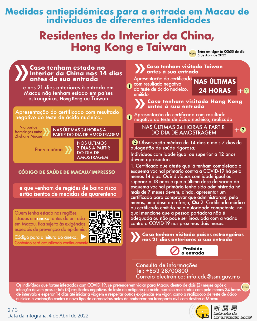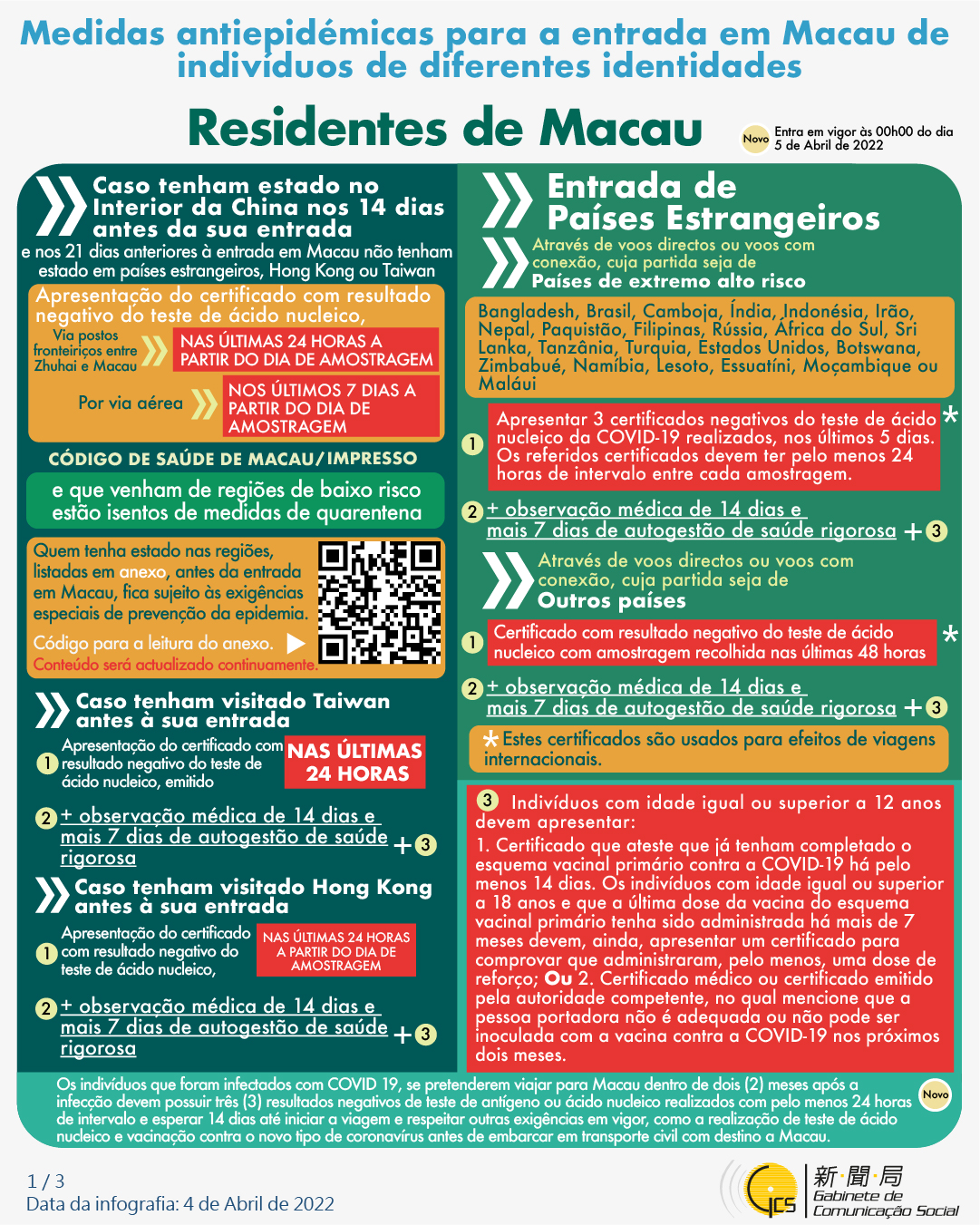 (Infografia)Medidas antiepidémicas para a entrada em Macau de indivíduos de diferentes identidades, actualizadas no dia 4 de Abril de 2022