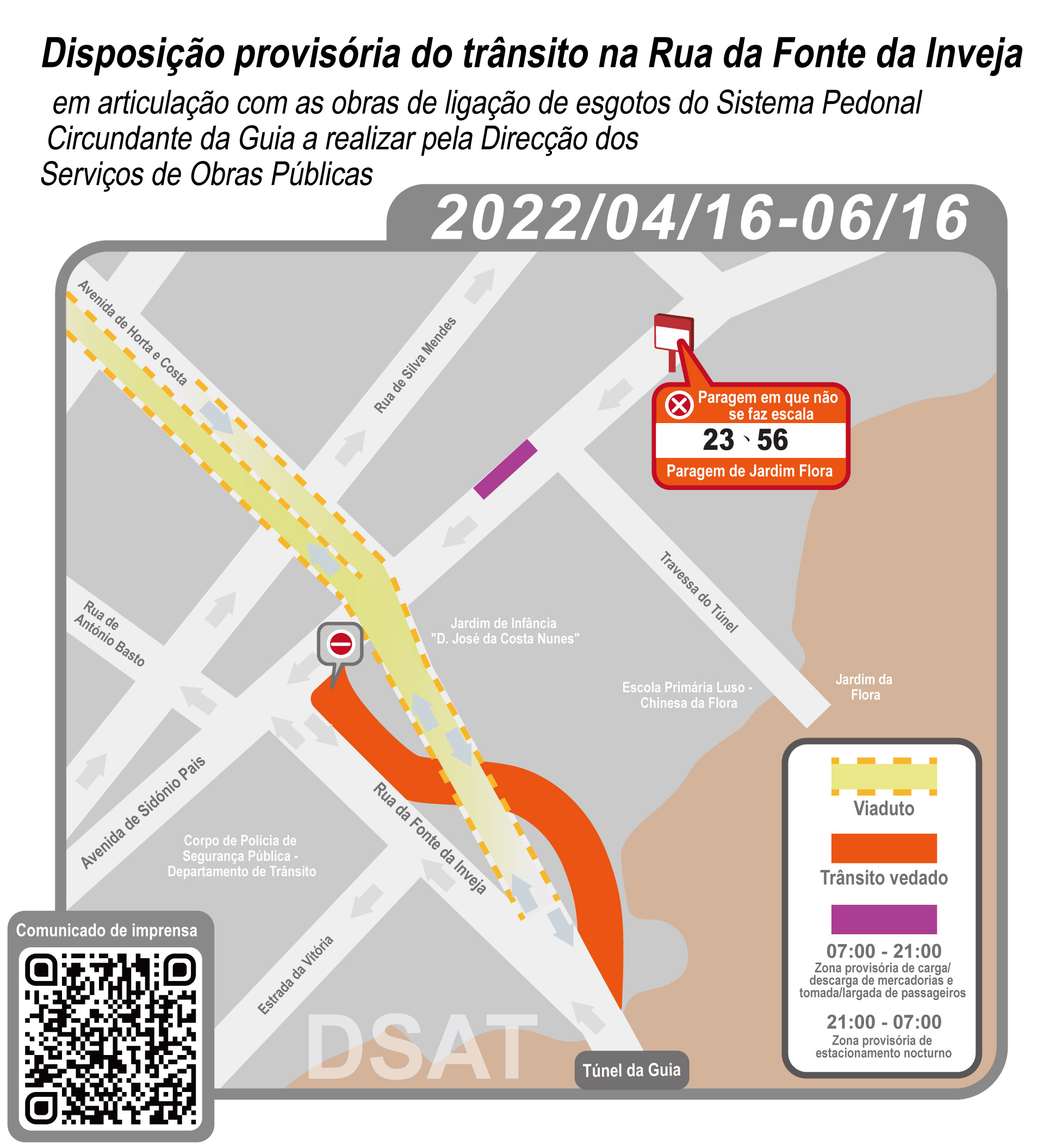 Em articulação com as obras de ligação de esgotos do Sistema Pedonal Circundante da Guia a realizar pela Direcção dos Serviços de Obras Públicas, a faixa de rodagem esquerda da Rua da Fonte da Inveja em direcção ao Túnel da Guia ficará vedada ao trânsito, de 16 de Abril a 16 de Junho, os condutores podem chegar à ZAPE pelo viaduto da Avenida de Horta e Costa ou por outras estradas em redor; em paralelo, alguns lugares com parquímetros para automóveis ligeiros situados na Avenida de Sidónio Pais perto do Edifício Lei Son, das 7h00 às 21h00 todos os dias durante o referido período, serão alterados provisoriamente em zona provisória de carga/descarga de mercadorias e tomada/largada de passageiros e, em zona provisória de estacionamento nocturno nas restantes horas do dia, com vista a atender às necessidades dos moradores, alunos, progenitores e estabelecimentos comerciais da zona em causa. A Direcção dos Serviços para os Assuntos de Tráfego (DSAT) apela ao público para prestar atenção à respectiva disposição e planear a sua deslocação com antecedência.