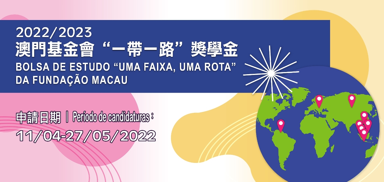 As Bolsas de Estudo “Uma Faixa, Uma Rota” da Fundação Macau compreendem dois tipos de bolsas: “Bolsa de Estudo no Exterior” e “Bolsa de Estudo em Macau”. As candidaturas à Bolsa de Estudo no Exterior” referente ao ano lectivo 2022/2023 decorrerão no período de 11 de Abril a 27 de Maio de 2022, e existem 20 vagas. A lista definitiva dos candidatos seleccionados será publicitada na primeira quinzena do mês de Agosto.