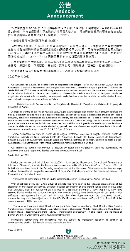 Tendo em consideração a evolução epidemiológica mais actualizada no Interior das China, os Serviços de Saúde, de acordo com os dispostos nos artigos 10.º e 14.º da Lei n.º 2/2004 (Lei de Prevenção, Controlo e Tratamento de Doenças Transmissíveis), determinam que a partir da 01h00 do dia 10 de Abril de 2022, todos os indivíduos que entrem ou já tenham entrado em Macau e tenham estado no local abaixo indicado, devem ser sujeitos à observação médica em local a designar, conforme exigências da autoridade de saúde, por um período de 14 dias a contar da data de saída destes locais, não podendo esse período ser inferior a 7 dias: Distrito Norte da Aldeia Escolar de Yingzhou do Distrito de Yingzhou da Cidade de Fuyang da Província de Anhui.
