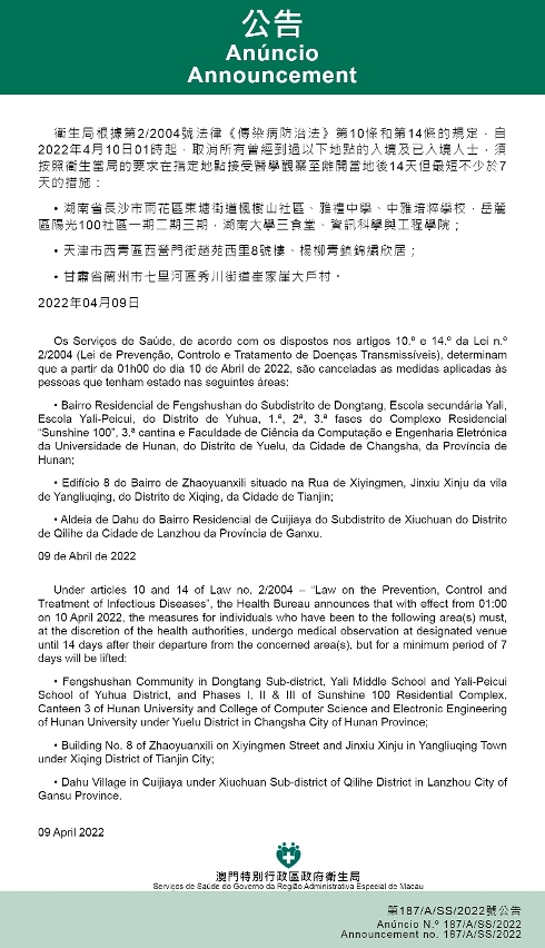Anuncia-se, ainda, que a partir da 01h00 do dia 10 de Abril de 2022, são canceladas as medidas aplicadas às pessoas que devem ser observadas e tenham estado nas seguintes áreas: Bairro Residencial de Fengshushan do Subdistrito de Dongtang, Escola secundária Yali, Escola Yali-Peicui, do Distrito de Yuhua, 1.ª, 2ª, 3.ª fases do Complexo Residencial “Sunshine 100”, 3.ª cantina e Faculdade de Ciência da Computação e Engenharia Eletrónica da Universidade de Hunan, do Distrito de Yuelu, da Cidade de Changsha, da Província de Hunan; Edifício 8 do Bairro de Zhaoyuanxili situado na Rua de Xiyingmen, Jinxiu Xinju da vila de Yangliuqing, do Distrito de Xiqing, da Cidade de Tianjin; Aldeia de Dahu do Bairro Residencial de Cuijiaya do Subdistrito de Xiuchuan do Distrito de Qilihe da Cidade de Lanzhou da Província de Ganxu.