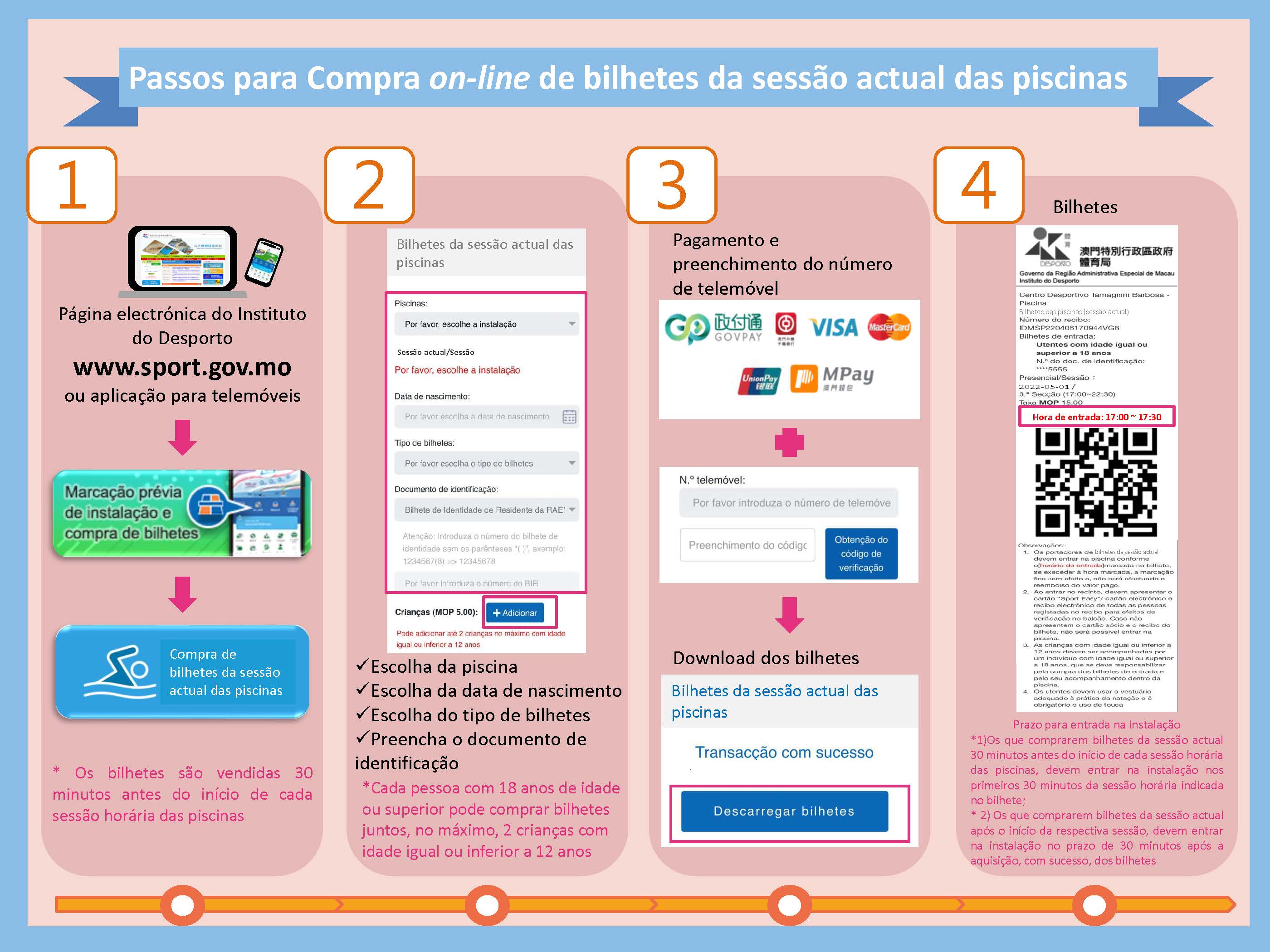 Em articulação com a Governação Electrónica da RAEM, a partir do dia 1 de Maio, o Instituto do Desporto irá adicionar o serviço de marcação online de bilhetes presenciais para as piscinas. Os bilhetes serão vendidos 30 minutos antes do horário de funcionamento de cada secção horária. Usando o bilhete de identidade ou o cartão de sócio “Sport Easy”, o interessado pode aceder à página electrónica do Instituto do Desporto www.sport.gov.mo ou entrar na aplicação de telemóvel, escolher “marcação prévia de instalação e compra de bilhetes” e depois escolher “Compra de bilhetes presenciais”; selecionar a piscina pretendida, preencher os dados pessoais e efectuar o pagamento electrónico. A população pode descarregar pessoalmente o bilhete e o Instituto do Desporto emite um código QR que remete ao interessado por mensagem de telemóvel. Além disso, as crianças com idade igual ou inferior a 12 anos, não podem aceder sozinhas às piscinas, devendo estar acompanhados por um adulto com idade igual ou superior a 18 anos. Cada adulto pode comprar bilhetes para até 2 crianças com idade igual ou inferior a 12 anos.