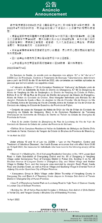 Anuncia-se, ainda, que a partir da 01h00 do dia 15 de Abril de 2022, são canceladas as medidas aplicadas às pessoas que entrem e já tenham entrado em Macau, mas que tenham saído dos locais afectados há menos de 14 dias, devem estar atentos ao seu estado de saúde e ser sujeitos a testes de ácido nucleico por iniciativa própria, na ordem temporal de 1.º, 4.º e 7.º dias, e o Código de Saúde deles não será convertido para a cor amarela durante esse período: Cidade de Wuhu da Província de Anhui; Vila de Gaobu da Cidade de Dongguan da Província de Cantão (Guangdong).