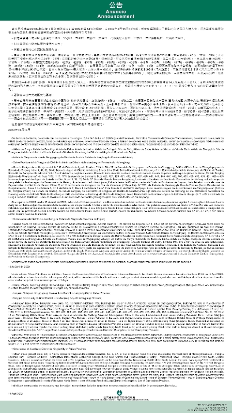 Tendo em consideração a evolução epidemiológica mais actualizada no Interior da China, os Serviços de Saúde, de acordo com os dispostos nos artigos 10.º e 14.º da Lei n.º 2/2004 (Lei de Prevenção, Controlo e Tratamento de Doenças Transmissíveis), determinam que a partir da 01h00 do dia 15 de Abril de 2022, todos os indivíduos que entrem ou já tenham entrado em Macau e tenham estado nos locais abaixo indicados, devem ser sujeitos à observação médica em local a designar, conforme exigências da autoridade de saúde, por um período de 14 dias a contar da data de saída destes locais, não podendo esse período ser inferior a 7 dias: