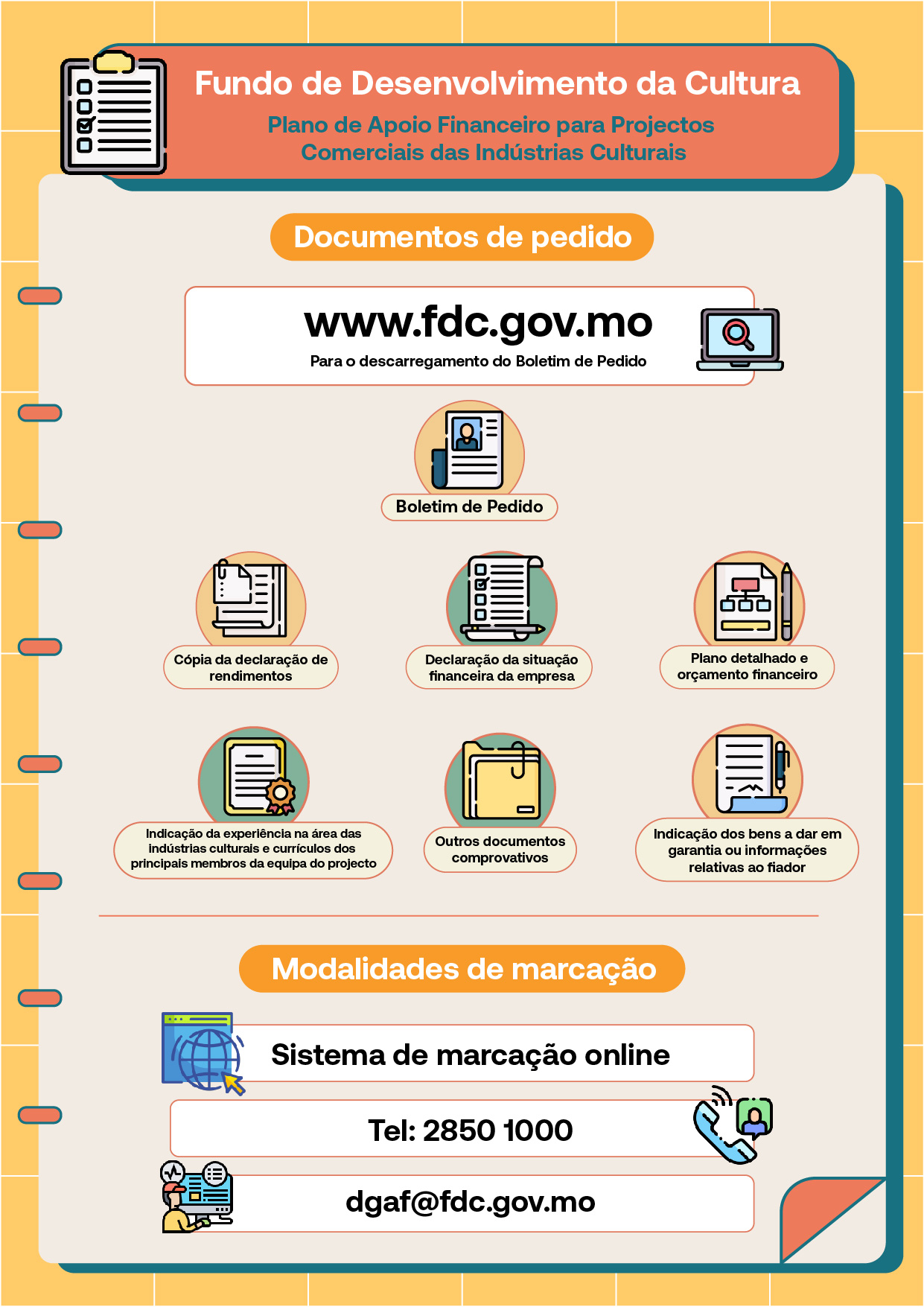 As empresas interessadas podem, através da página electrónica do FDC ( www.fdc.gov.mo ), descarregar o Boletim de Pedido e efectuar uma marcação para a apresentação do pedido. Para mais informações, é favor contactar-nos, através de telefone n.º 28501000 ou por email, dgaf@fdc.gov.mo.