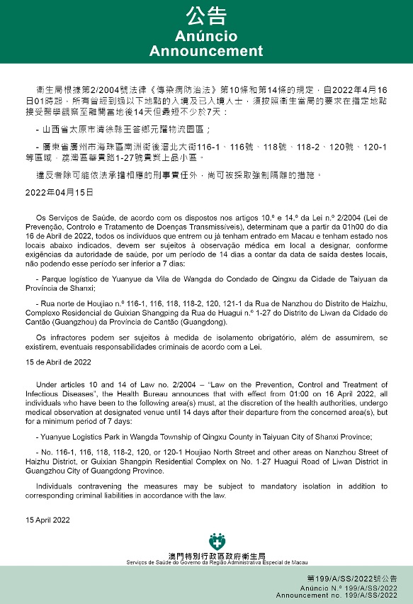 Tendo em consideração a evolução epidemiológica mais actualizada no Interior da China, os Serviços de Saúde, de acordo com os dispostos nos artigos 10.º e 14.º da Lei n.º 2/2004 (Lei de Prevenção, Controlo e Tratamento de Doenças Transmissíveis), determinam que a partir da 01h00 do dia 16 de Abril de 2022, todos os indivíduos que entrem ou já tenham entrado em Macau e tenham estado nos locais abaixo indicados, devem ser sujeitos à observação médica em local a designar, conforme exigências da autoridade de saúde, por um período de 14 dias a contar da data de saída destes locais, não podendo esse período ser inferior a 7 dias: