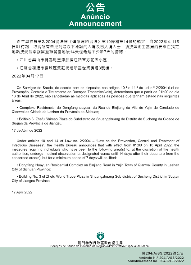 Tendo em consideração a evolução epidemiológica mais actualizada no Interior da China, os Serviços de Saúde, de acordo com os dispostos nos artigos 10.º e 14.º da Lei n.º 2/2004 (Lei de Prevenção, Controlo e Tratamento de Doenças Transmissíveis), determinam que a partir da 01h00 do dia 18 de Abril de 2022, todos os indivíduos que entrem ou já tenham entrado em Macau e tenham estado nos locais abaixo indicados, devem ser sujeitos à observação médica em local a designar, conforme exigências da autoridade de saúde, por um período de 14 dias a contar da data de saída destes locais, não podendo esse período ser inferior a 7 dias: